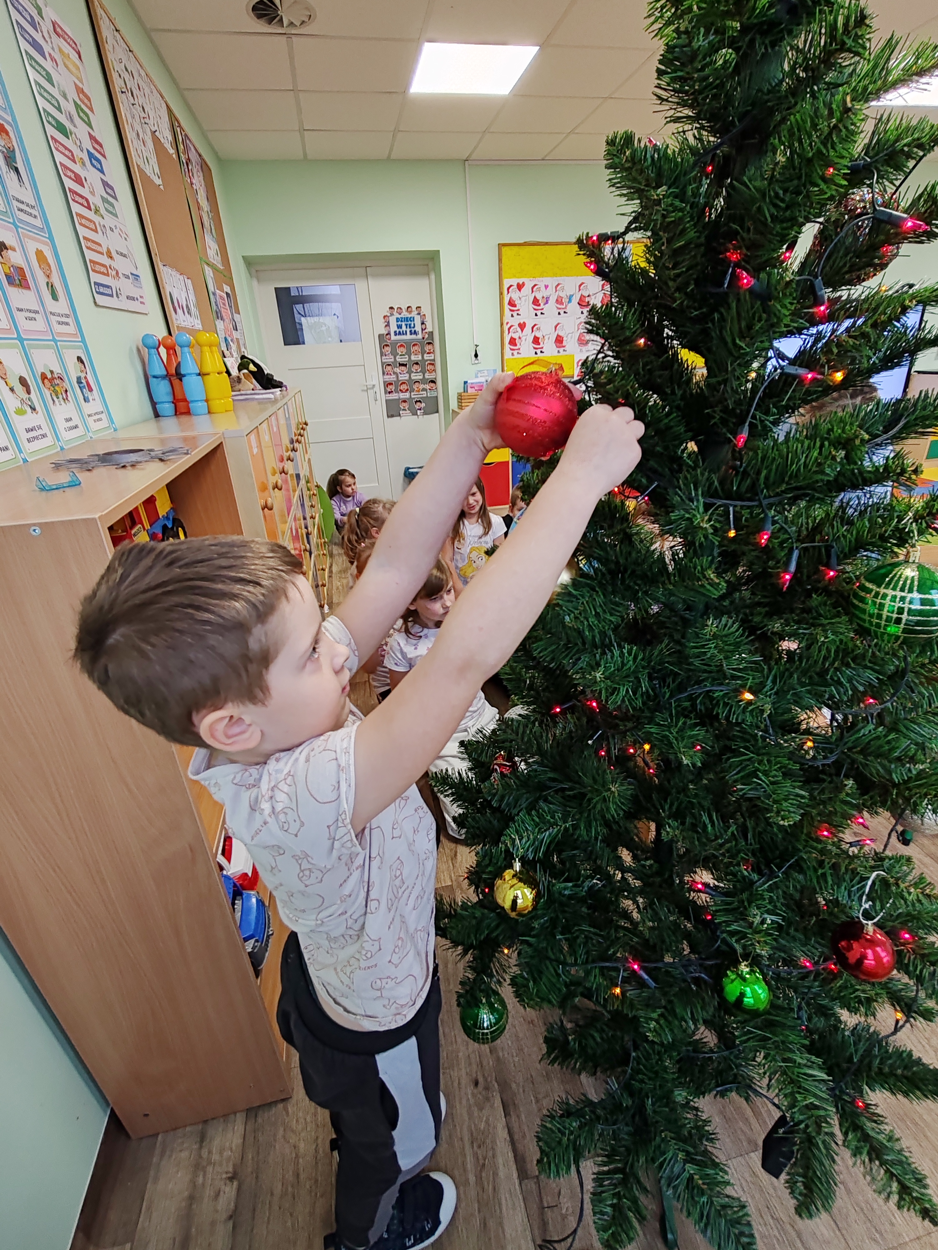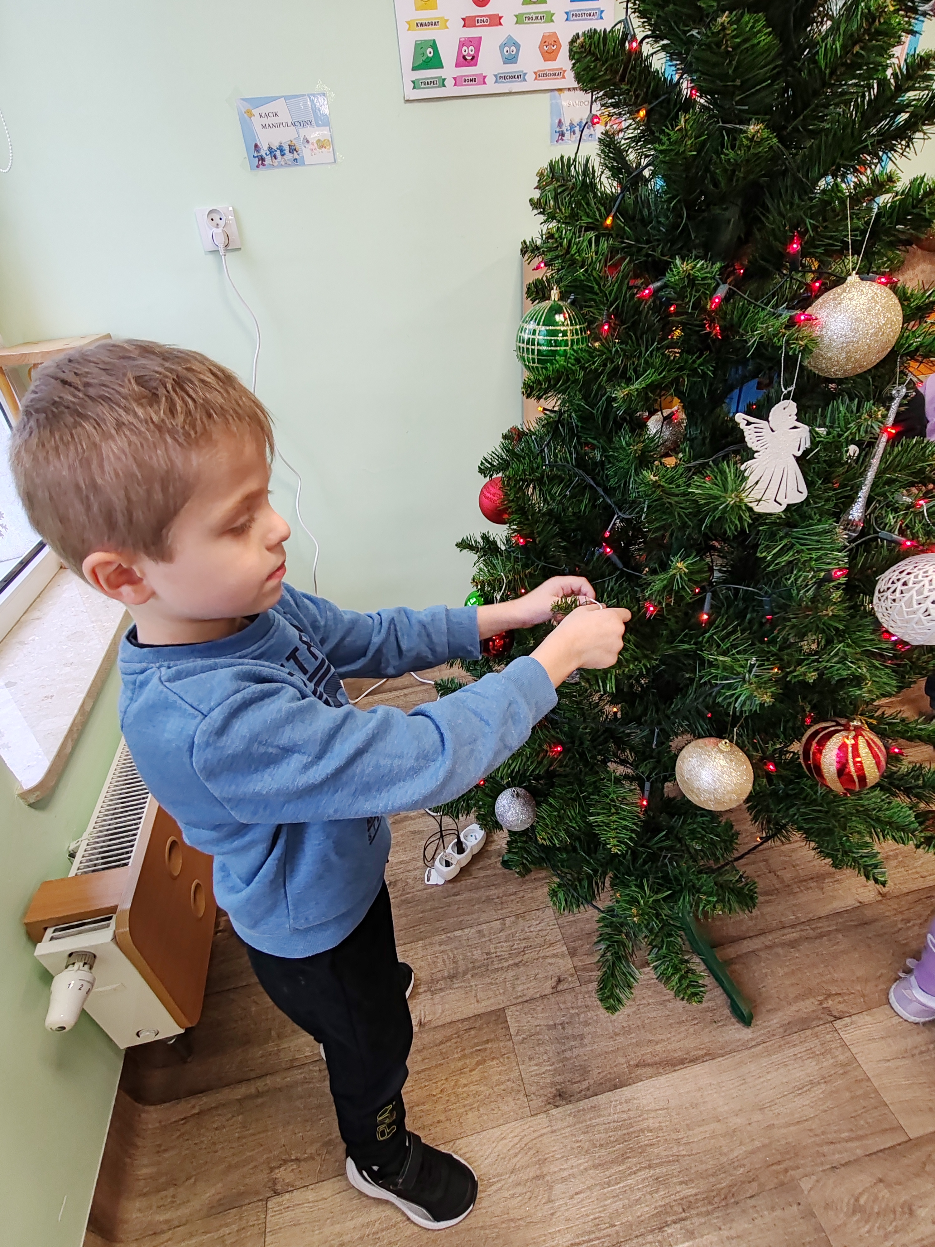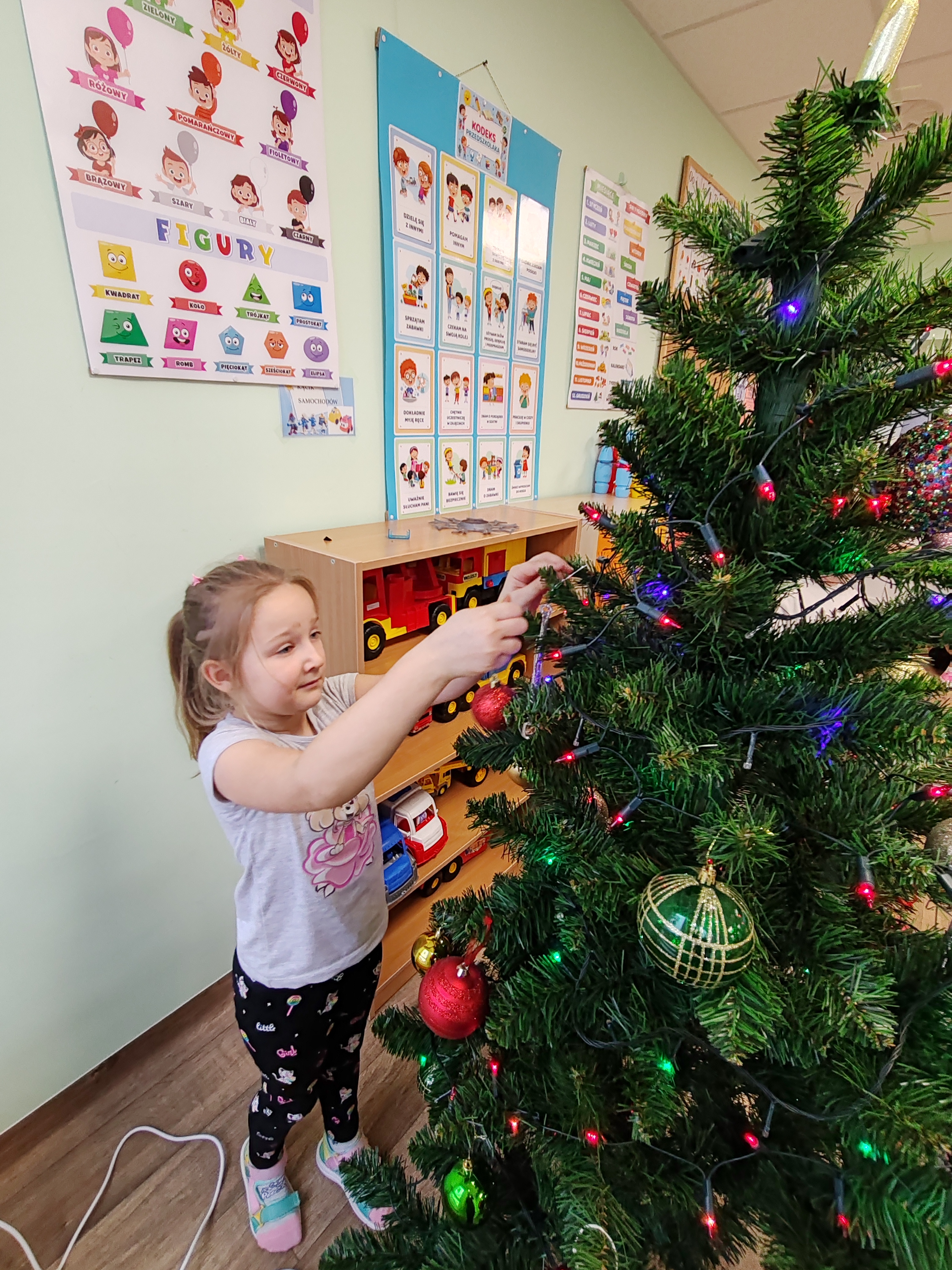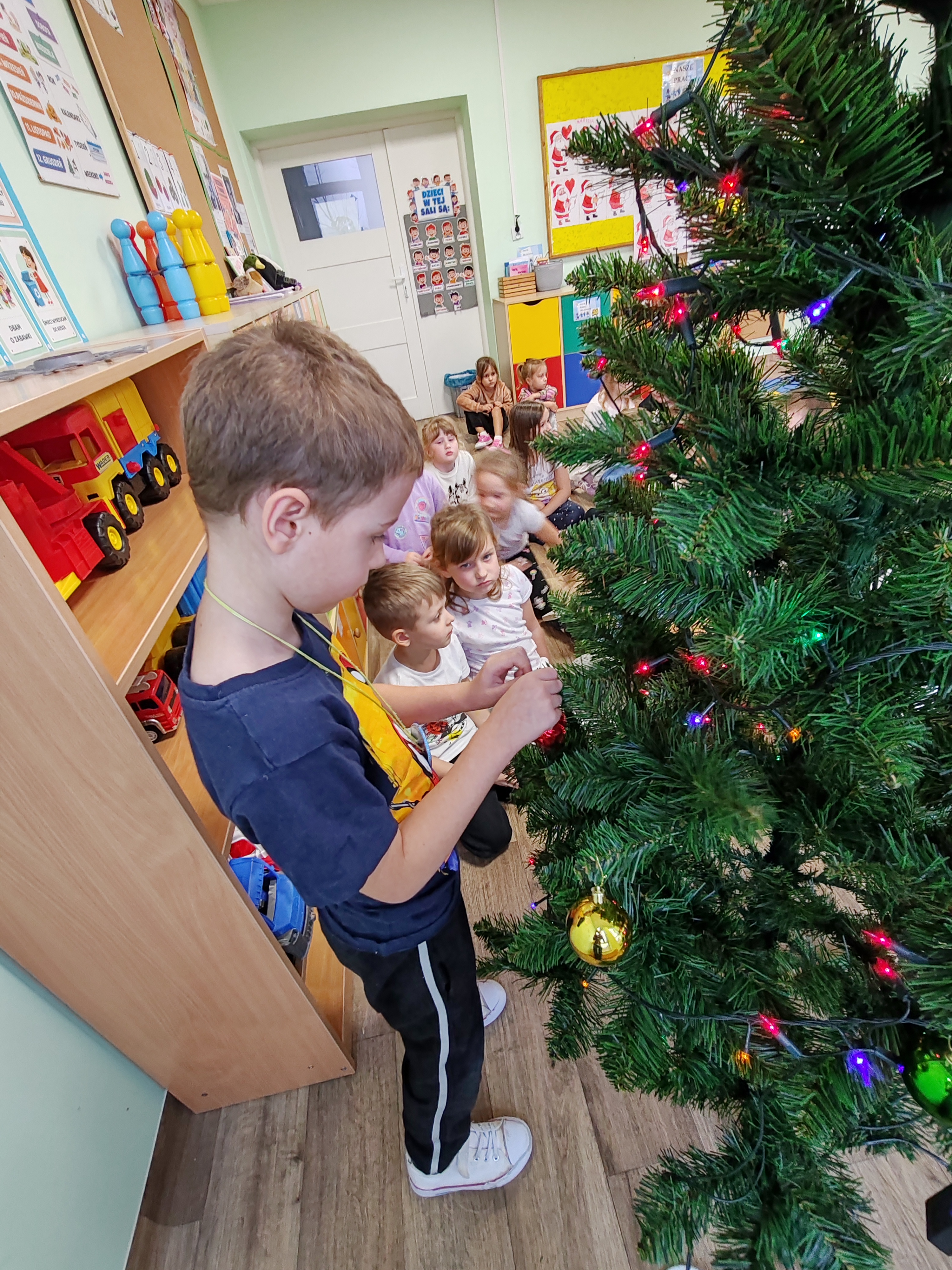 Dzisiaj wspólnie powiesiliśmy ozdoby i światełka na naszej choince.