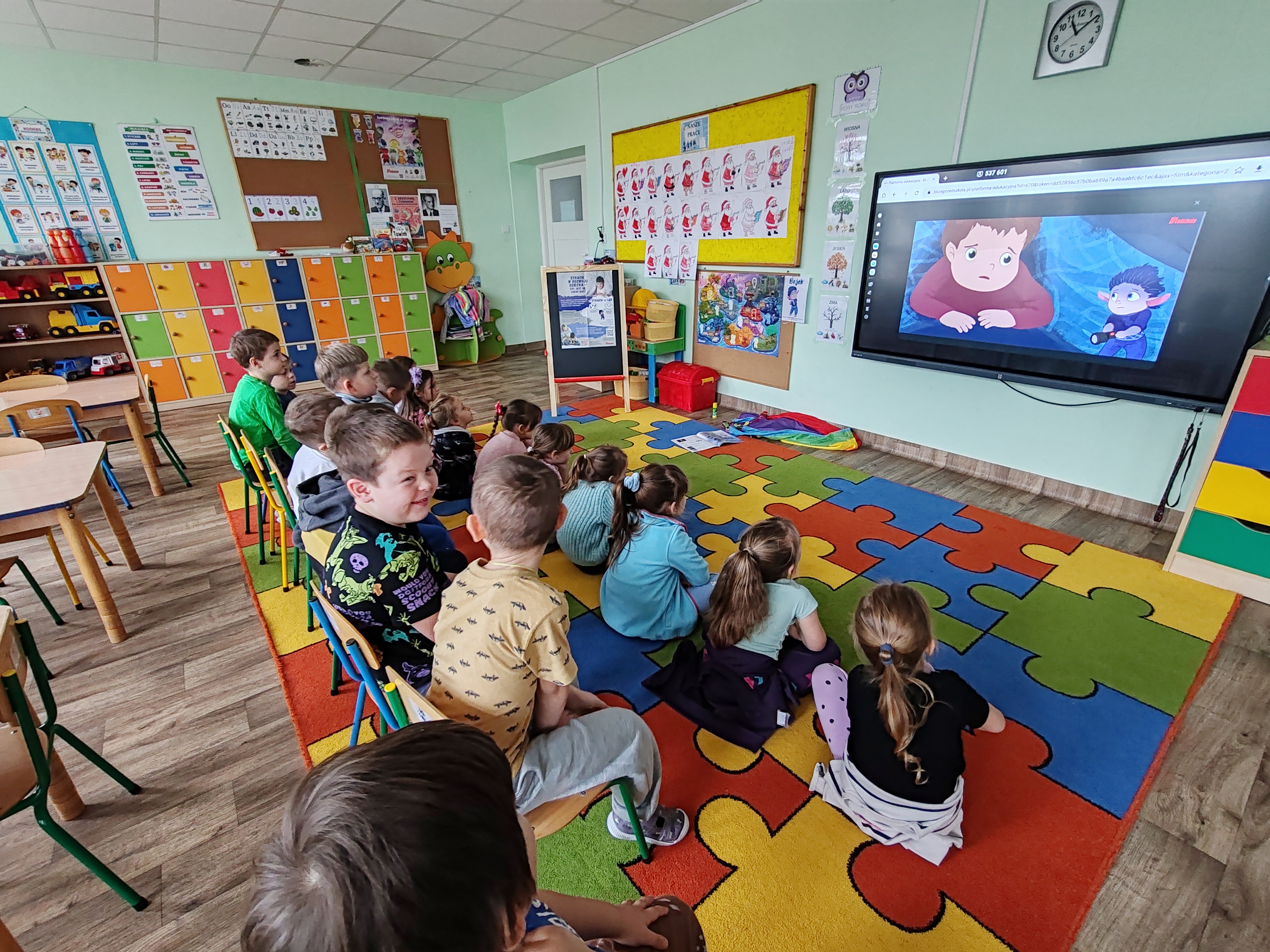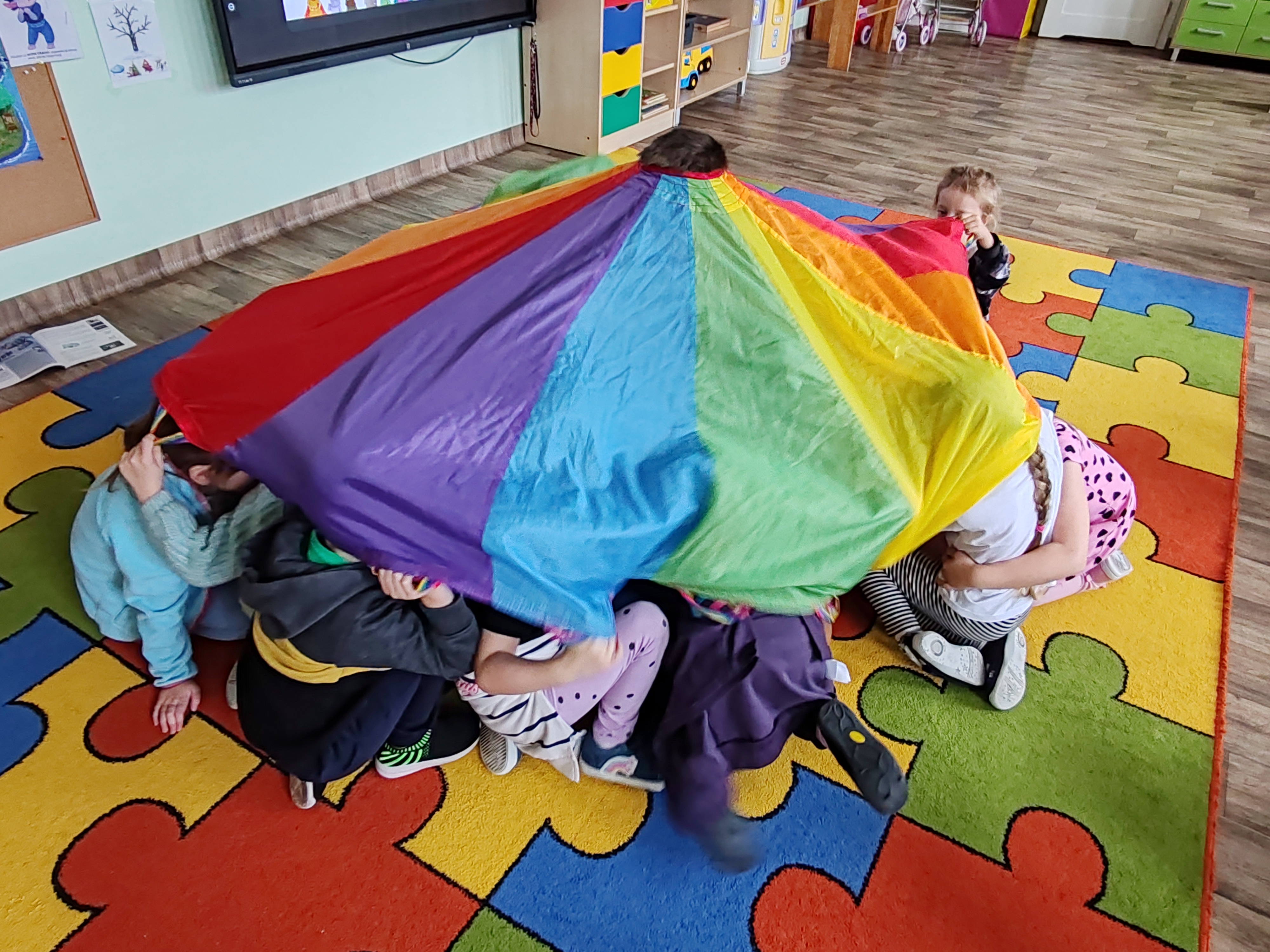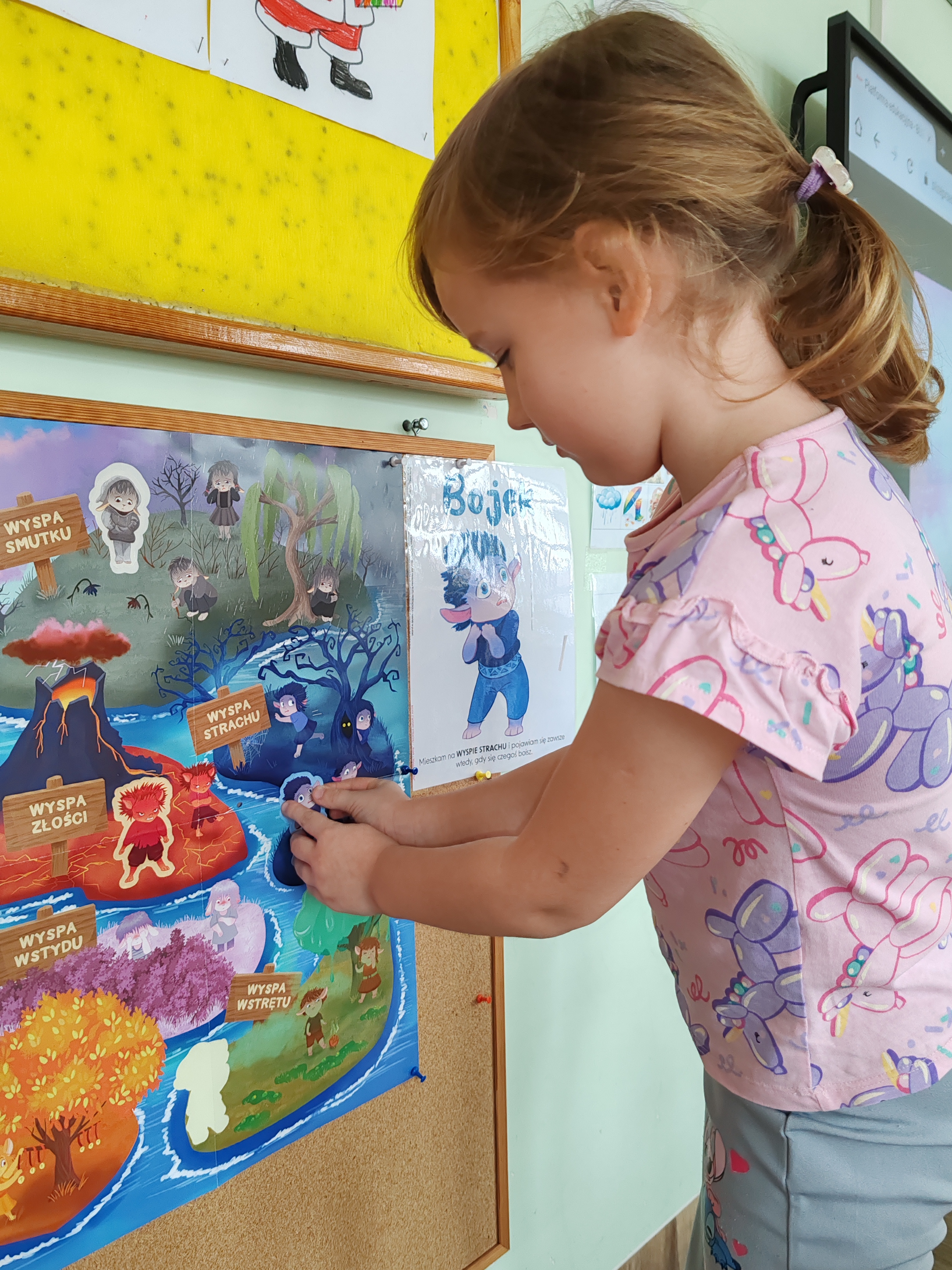Dzisiaj przedszkolaki poznały kolejną emocję- Bojka z Wyspy Strachu. Obejrzeliśmy film o strachu, rozmawialiśmy o tym, czego dzieci mogą się bać, a także bawiliśmy się z chustą animacyjną.