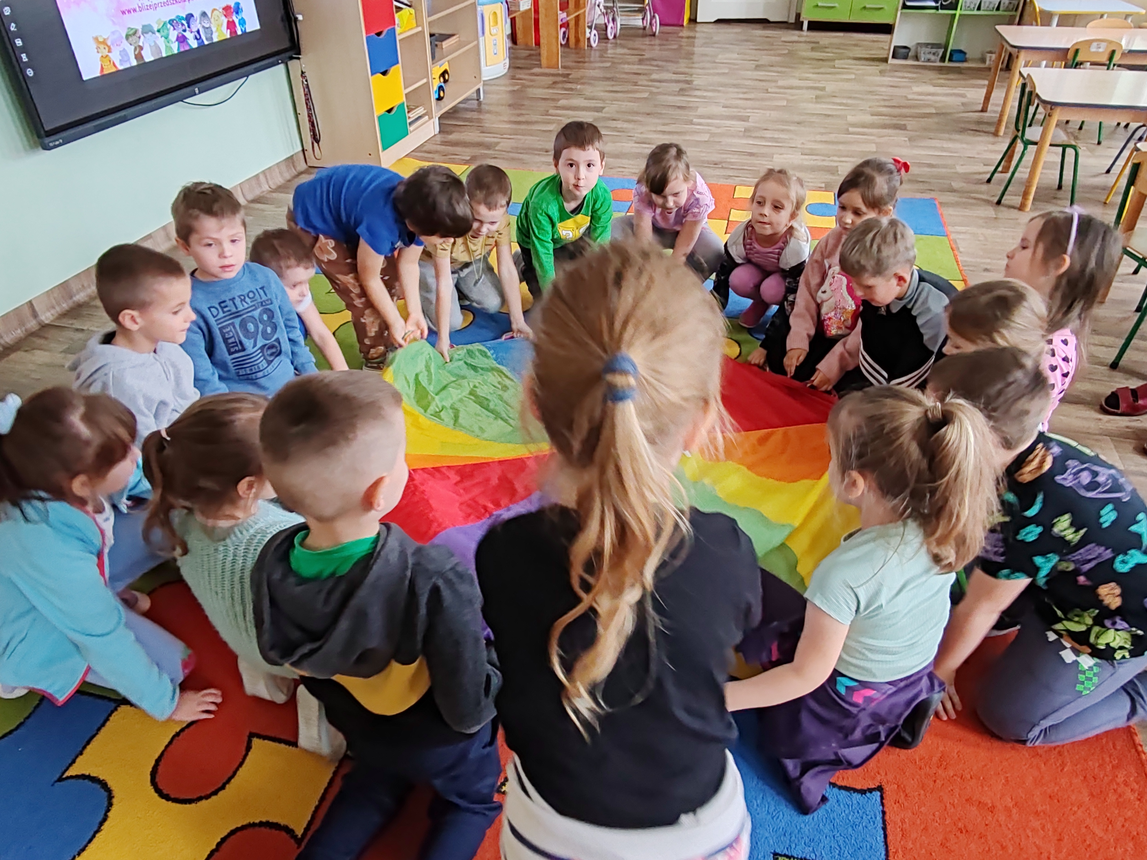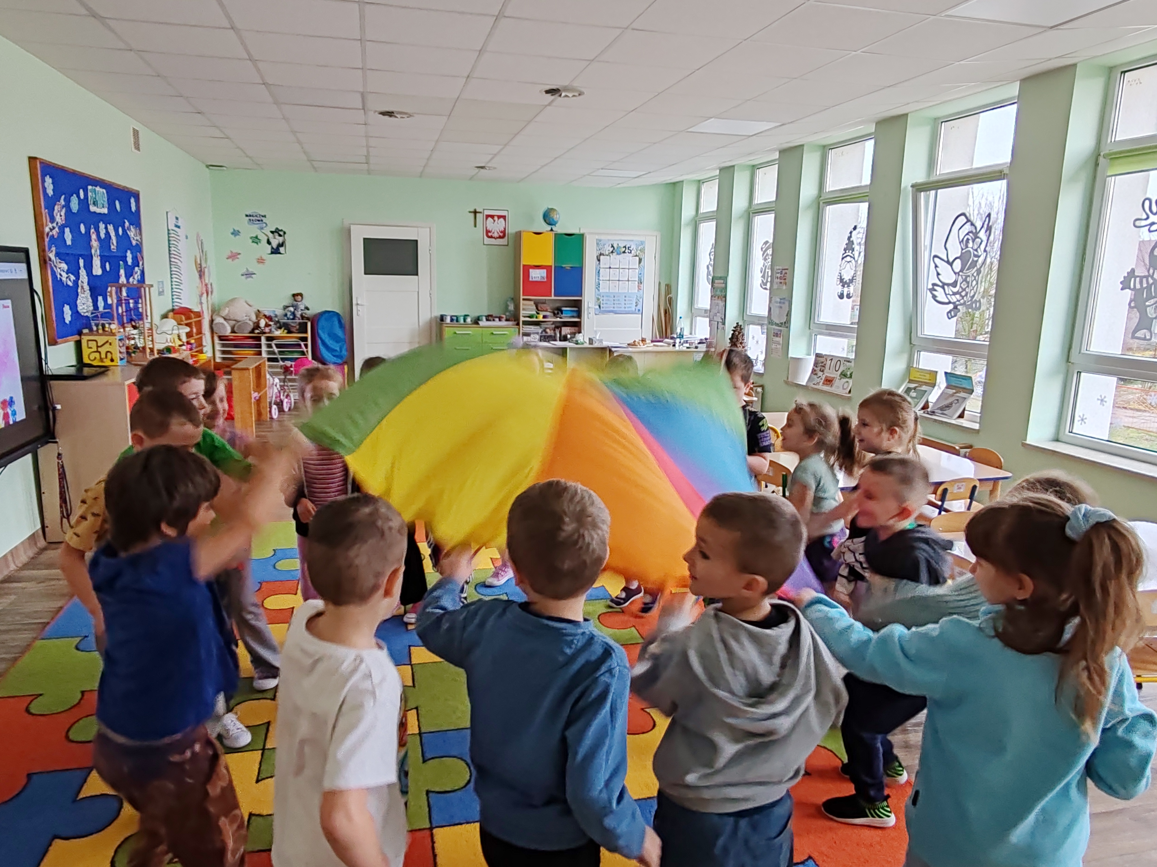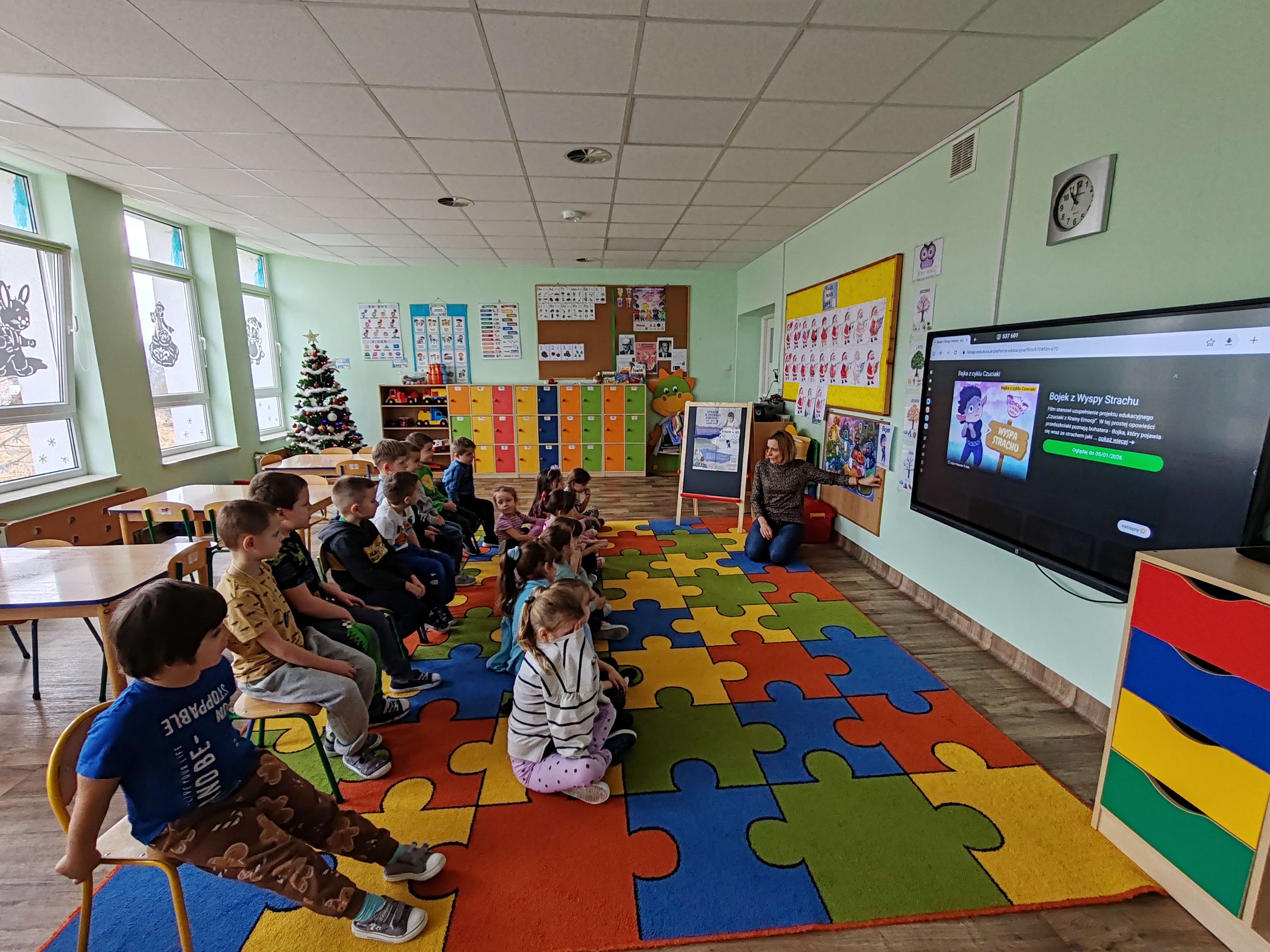 Dzisiaj przedszkolaki poznały kolejną emocję- Bojka z Wyspy Strachu. Obejrzeliśmy film o strachu, rozmawialiśmy o tym, czego dzieci mogą się bać, a także bawiliśmy się z chustą animacyjną.