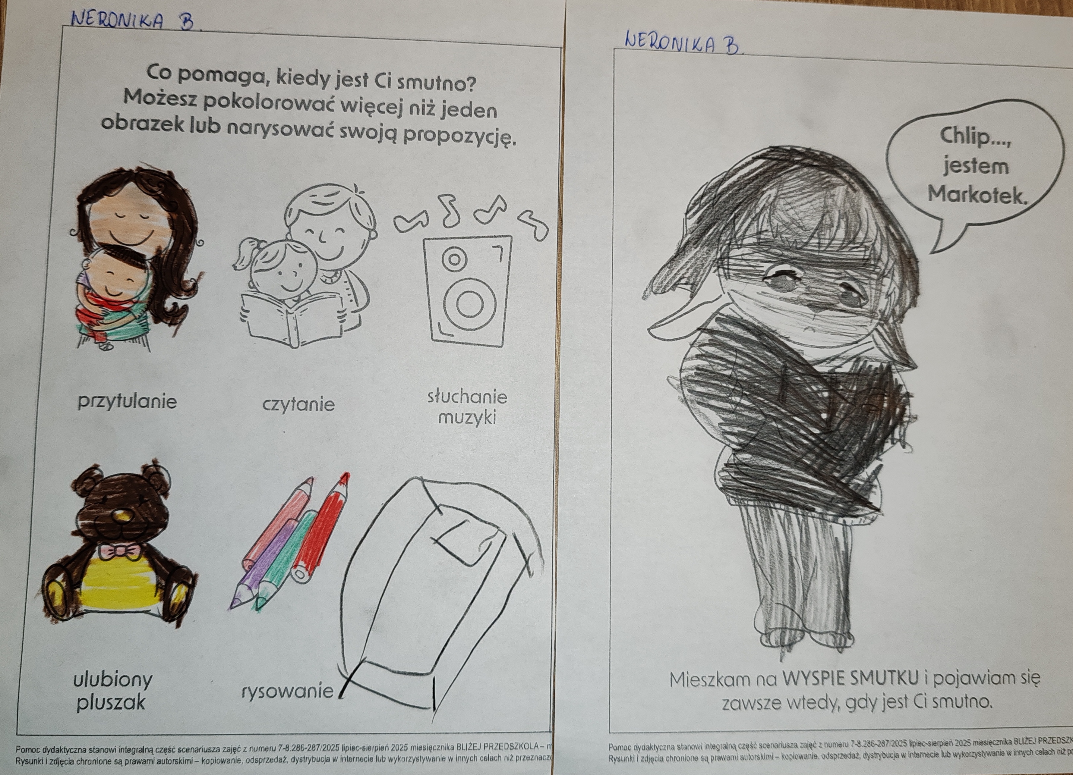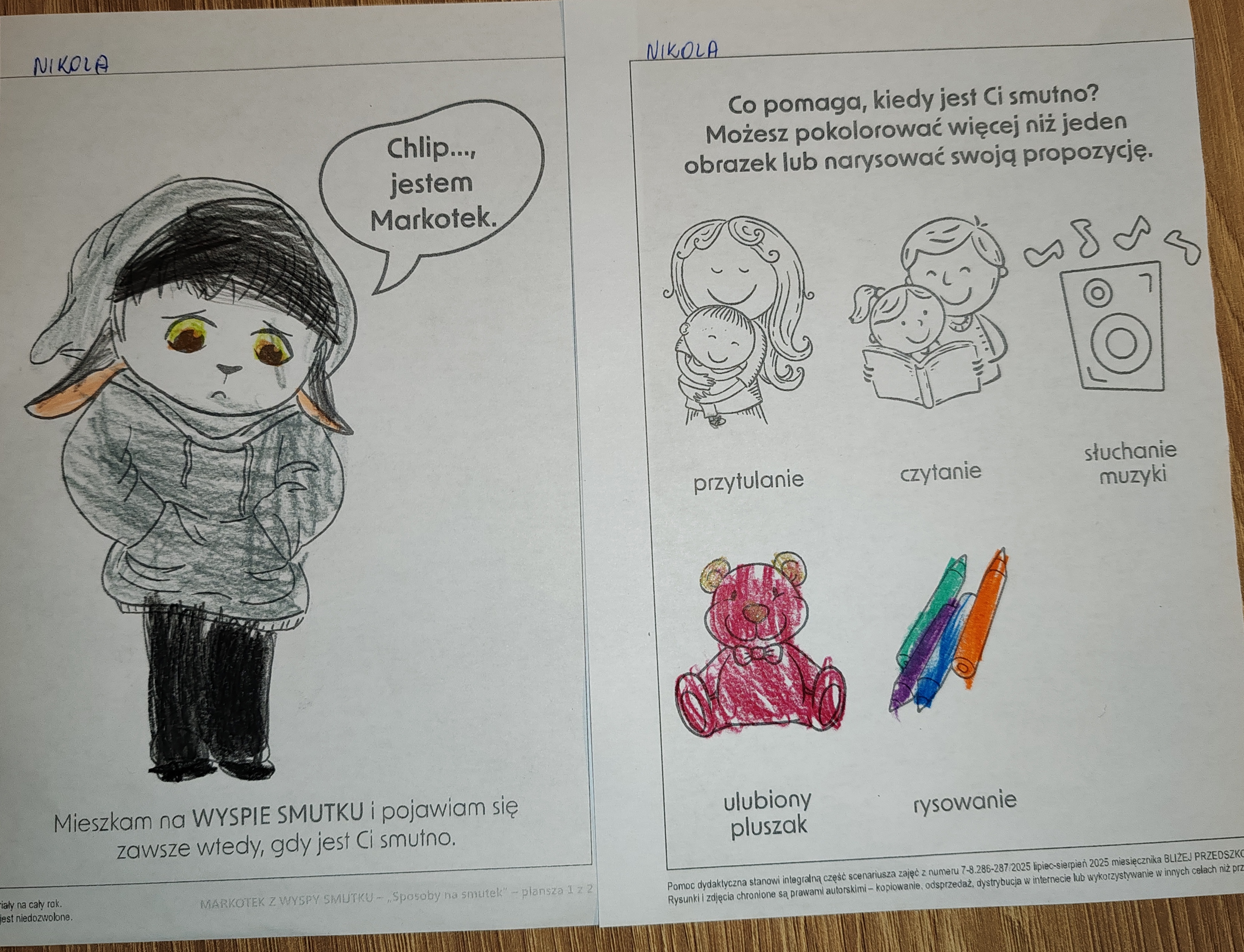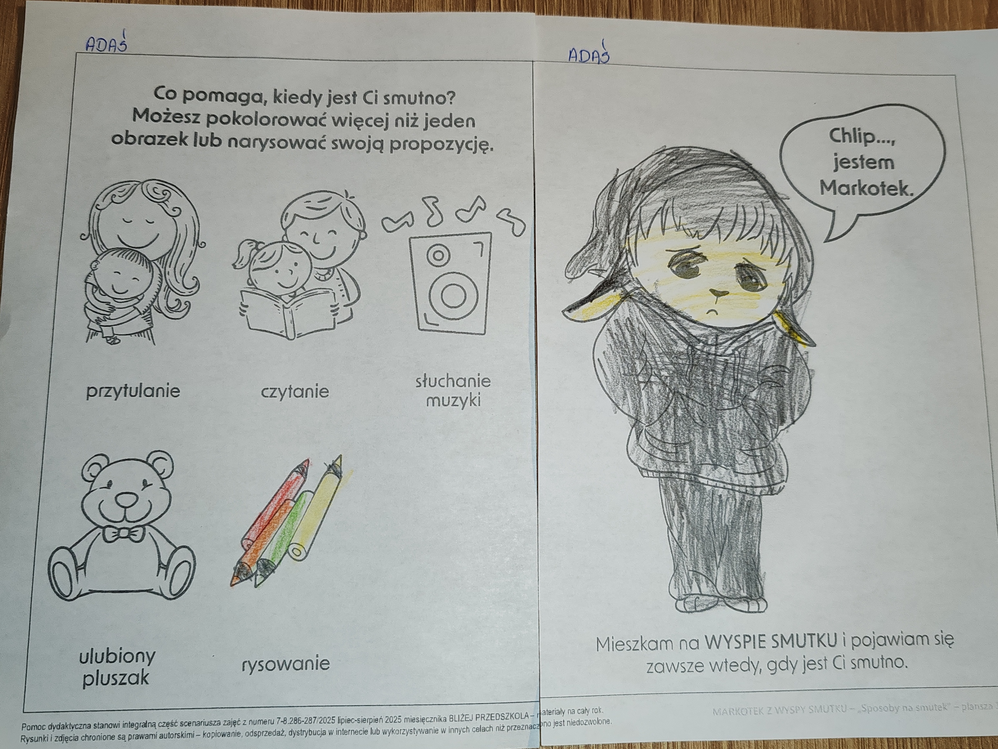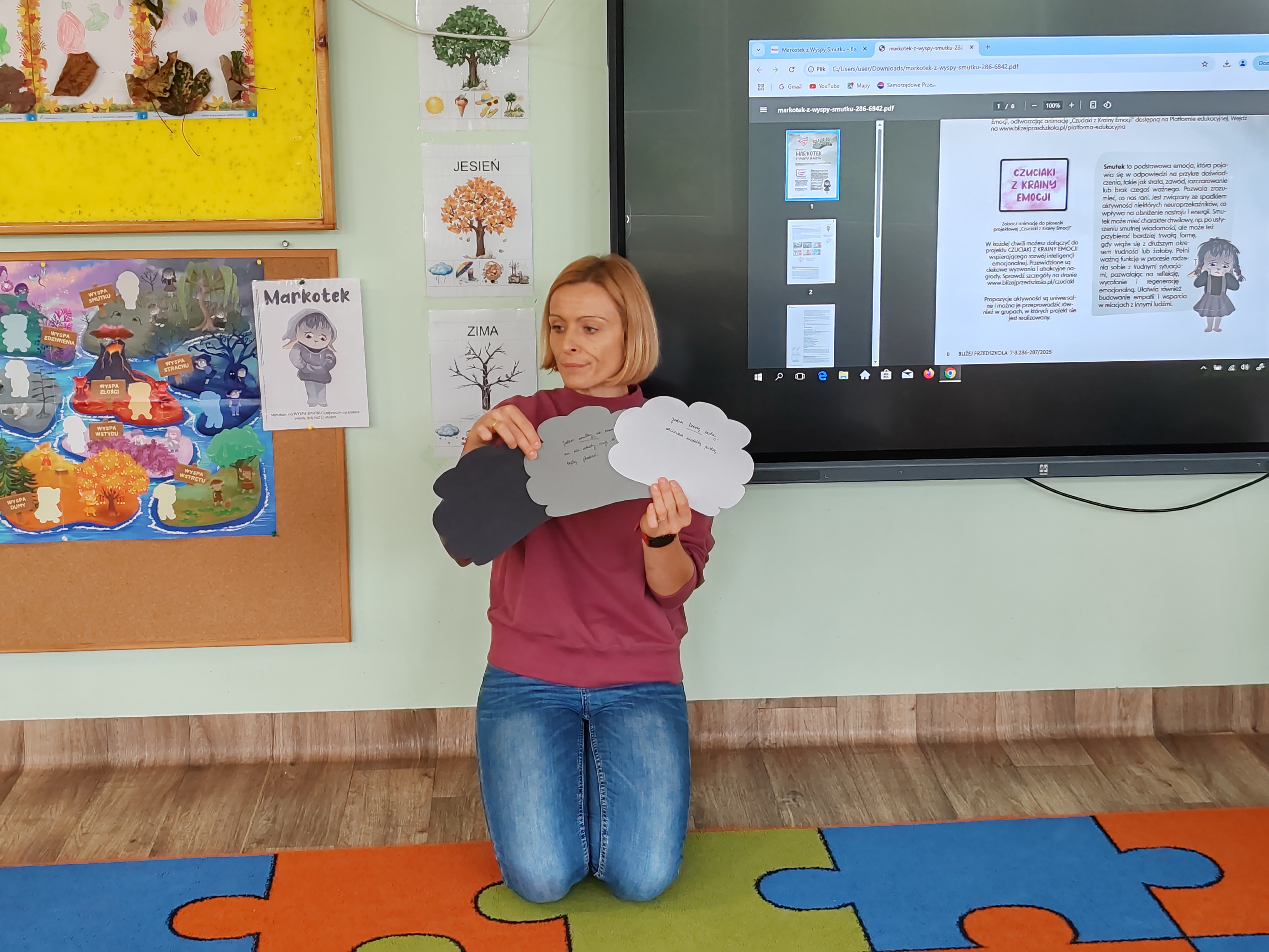 Przedszkolaki poznały nową emocję - smutek. Markotek z Wyspy Smutku opowiedział w bajce kiedy się pojawia i jak długo trwa. Dzieci bawiły się z chmurkami, których kolory oznaczały natężenie smutku, była również zabawa ruchowa a także kolorowanki.