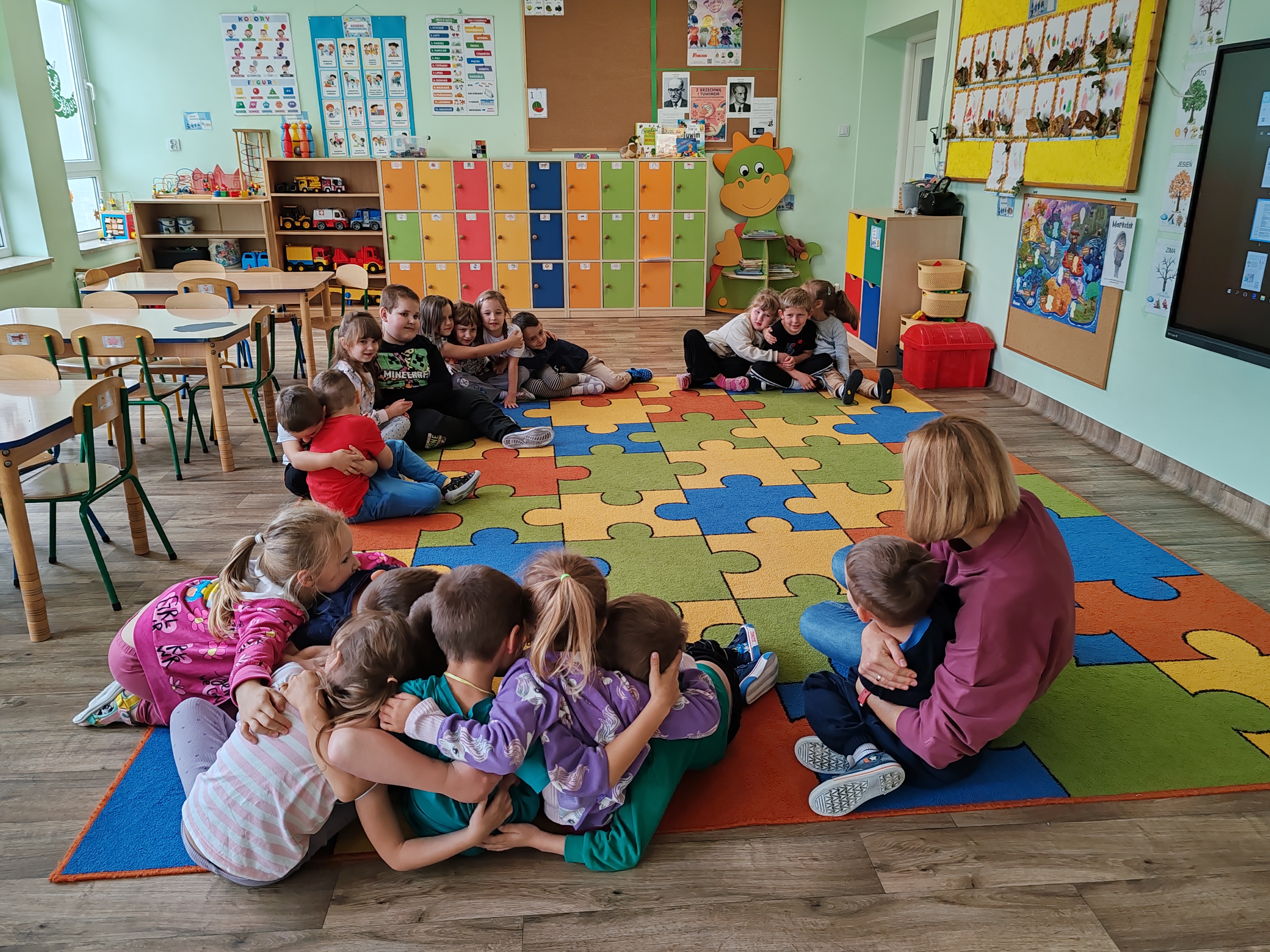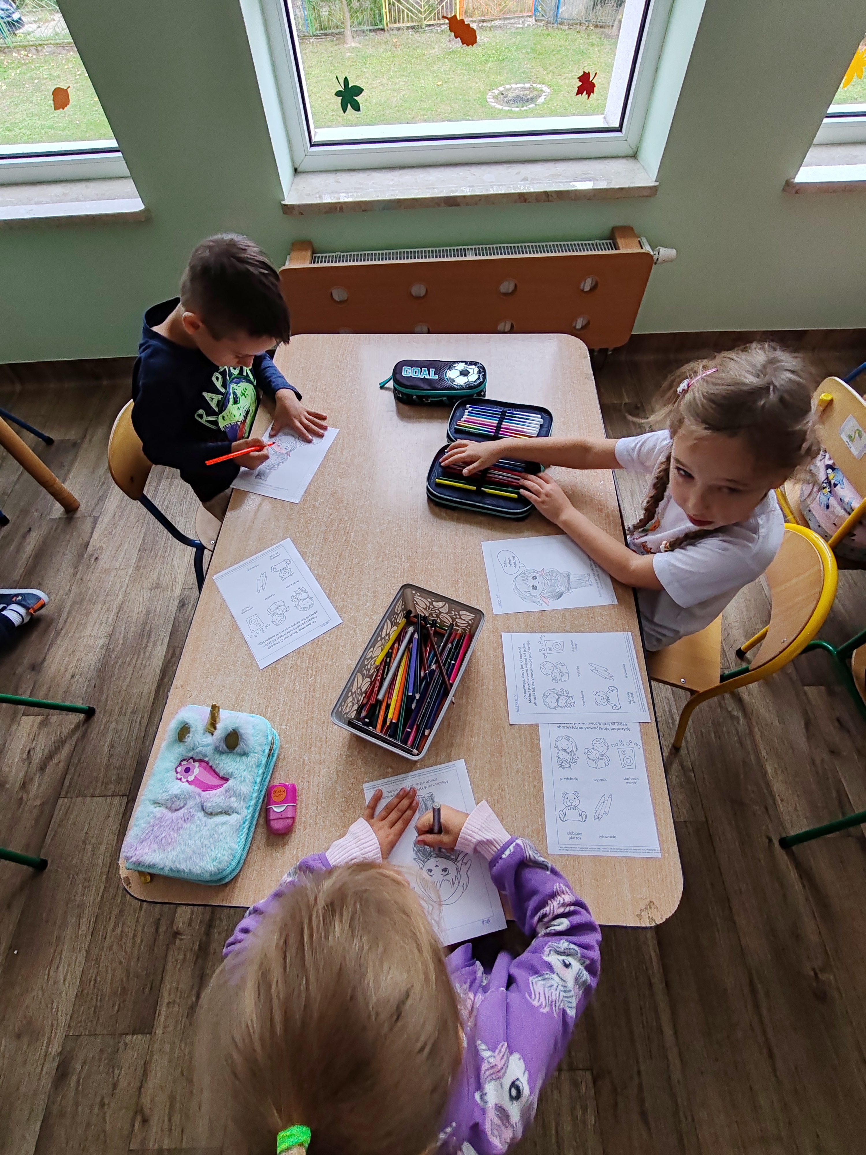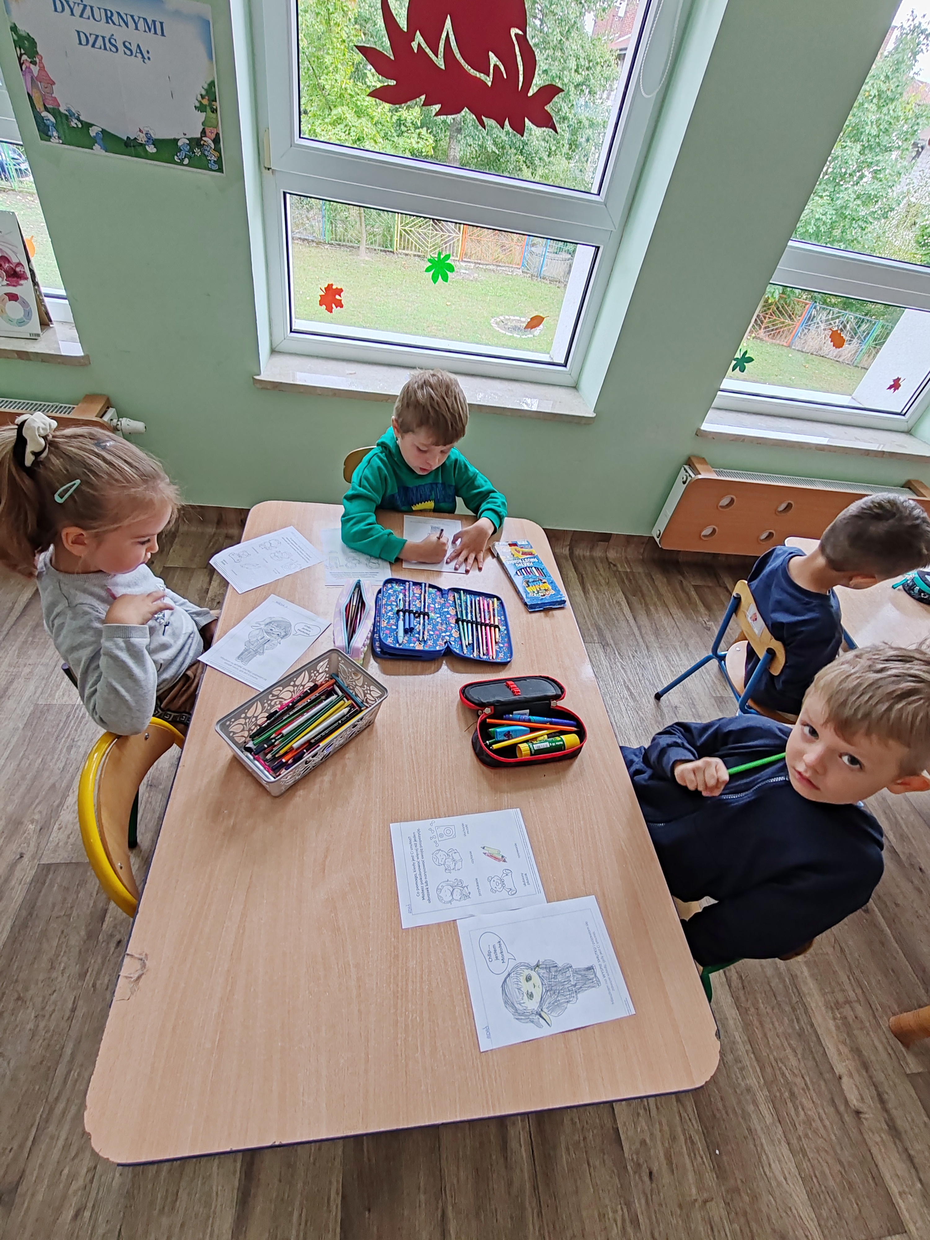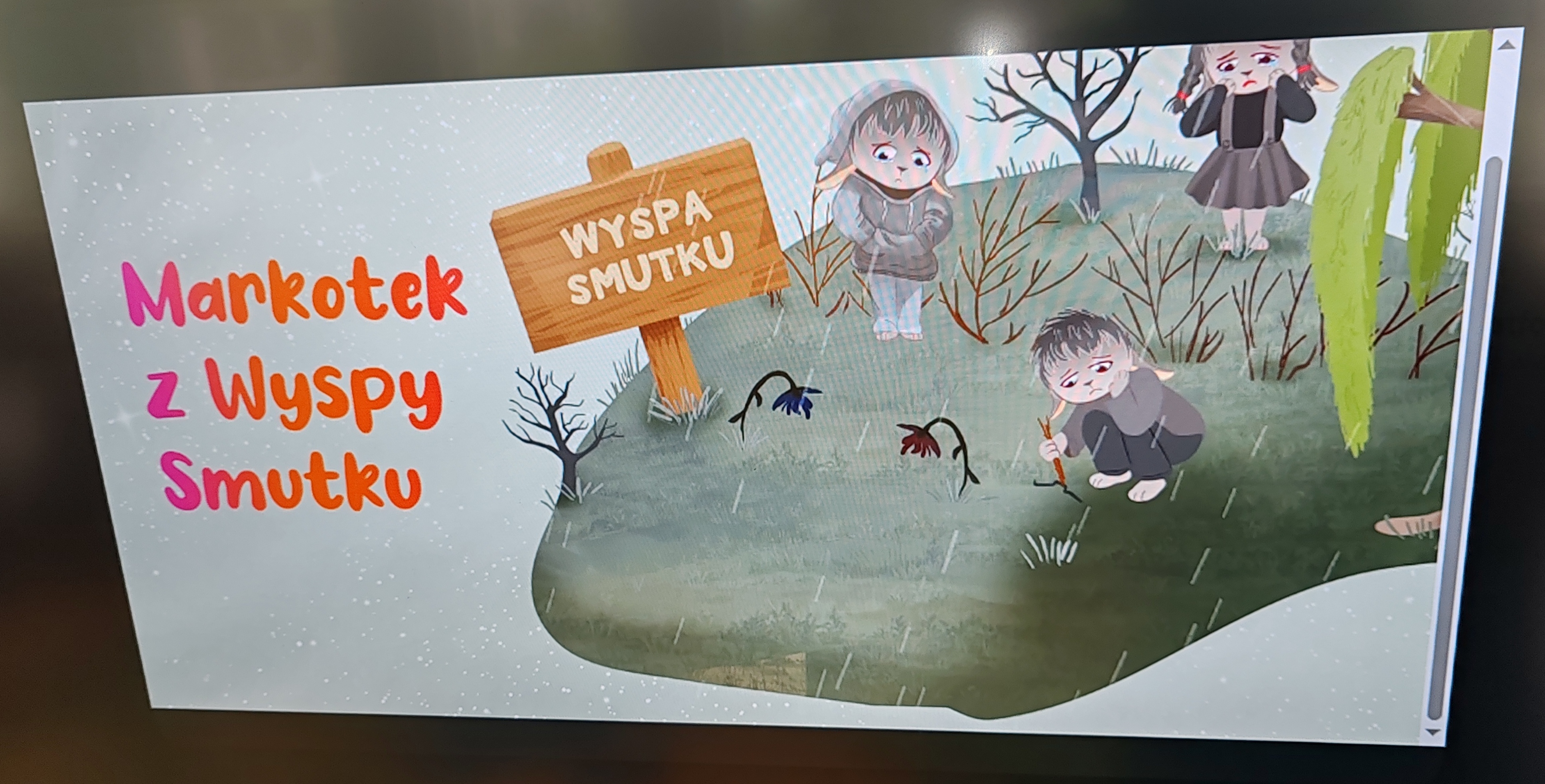 Przedszkolaki poznały nową emocję - smutek. Markotek z Wyspy Smutku opowiedział w bajce kiedy się pojawia i jak długo trwa. Dzieci bawiły się z chmurkami, których kolory oznaczały natężenie smutku, była również zabawa ruchowa a także kolorowanki.