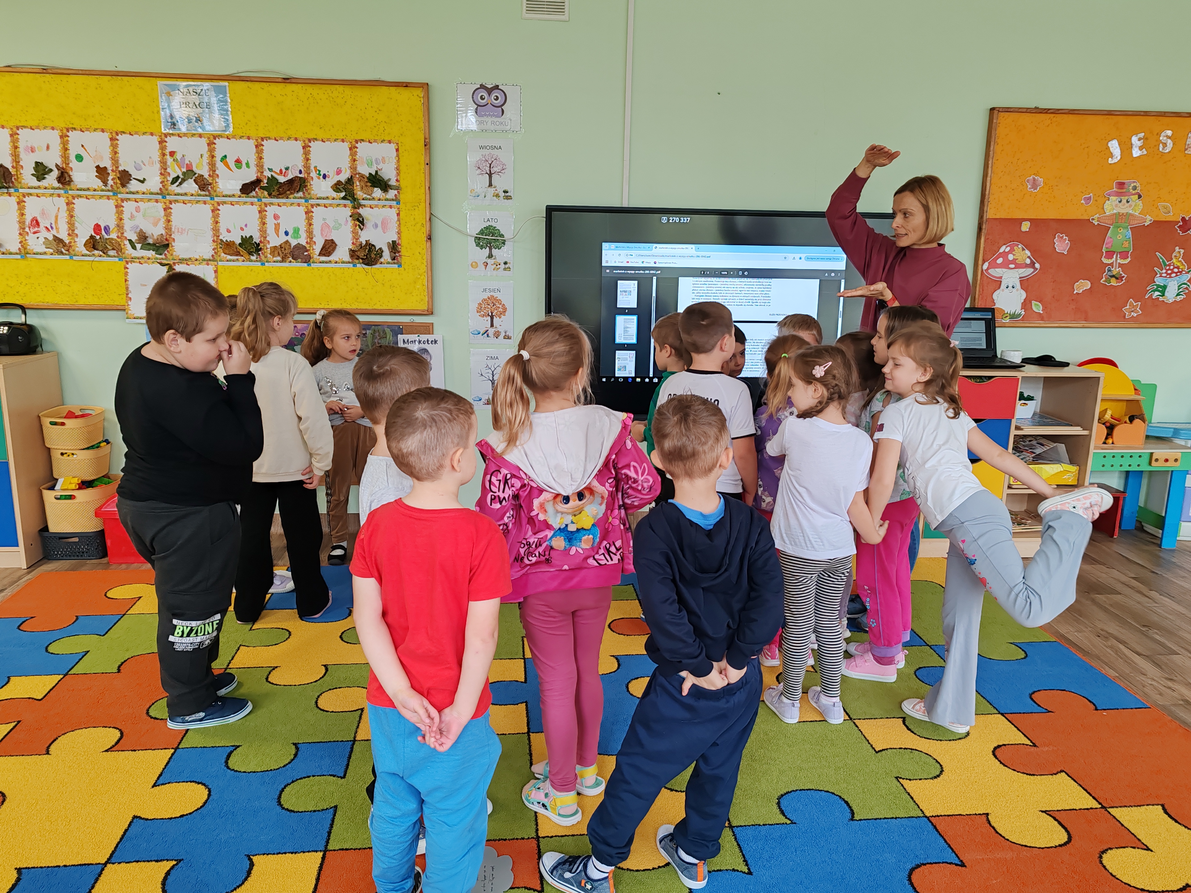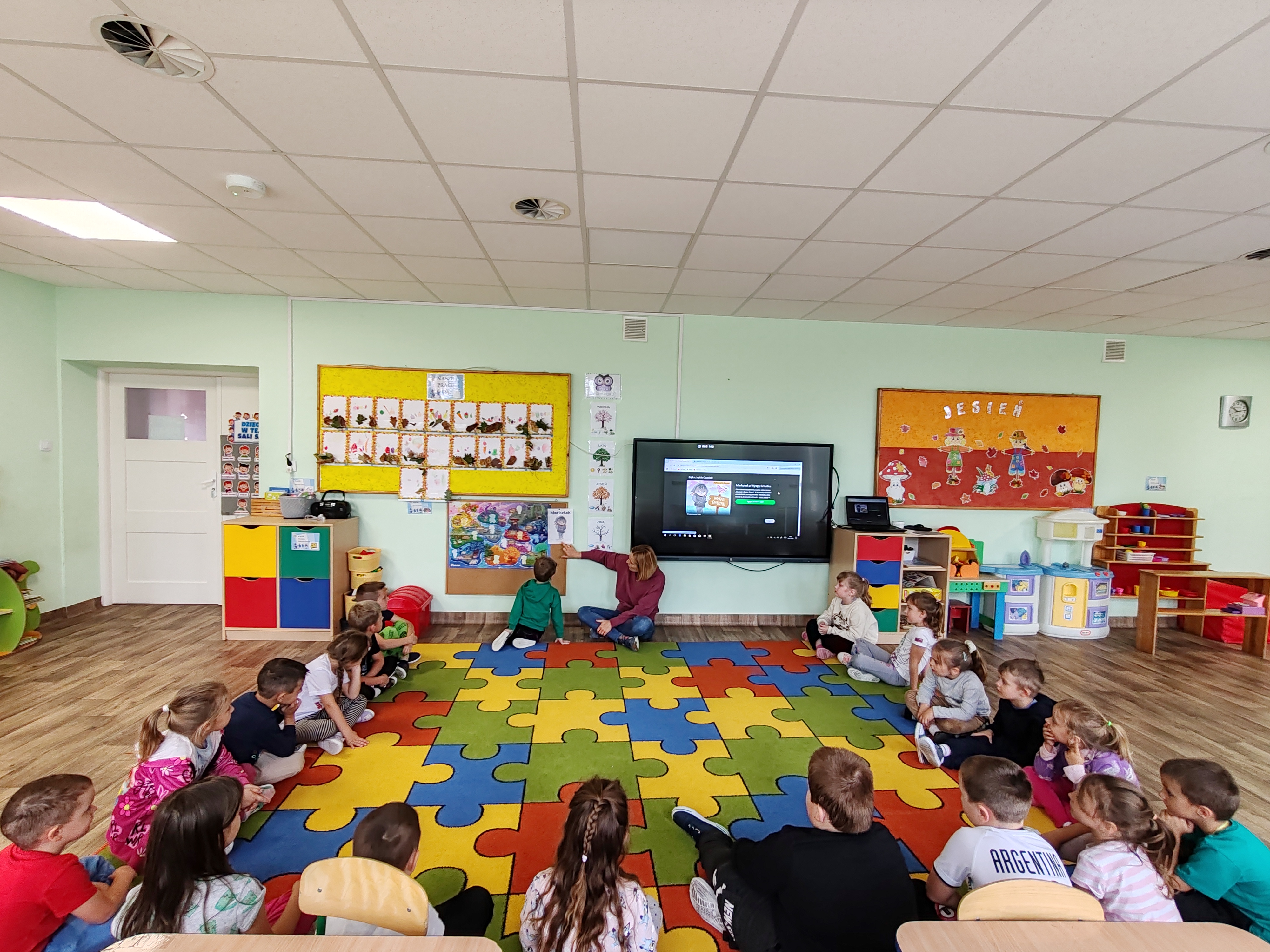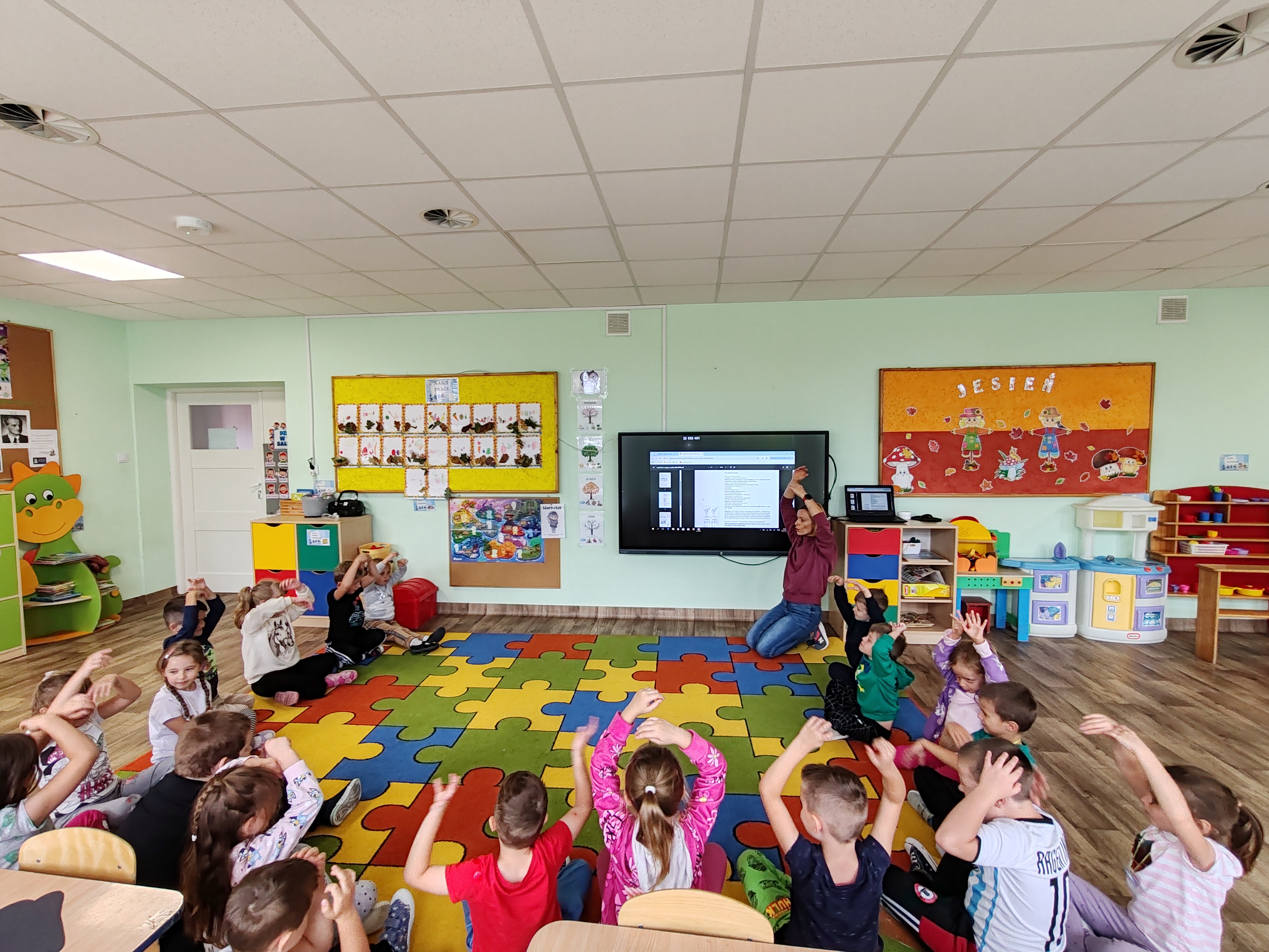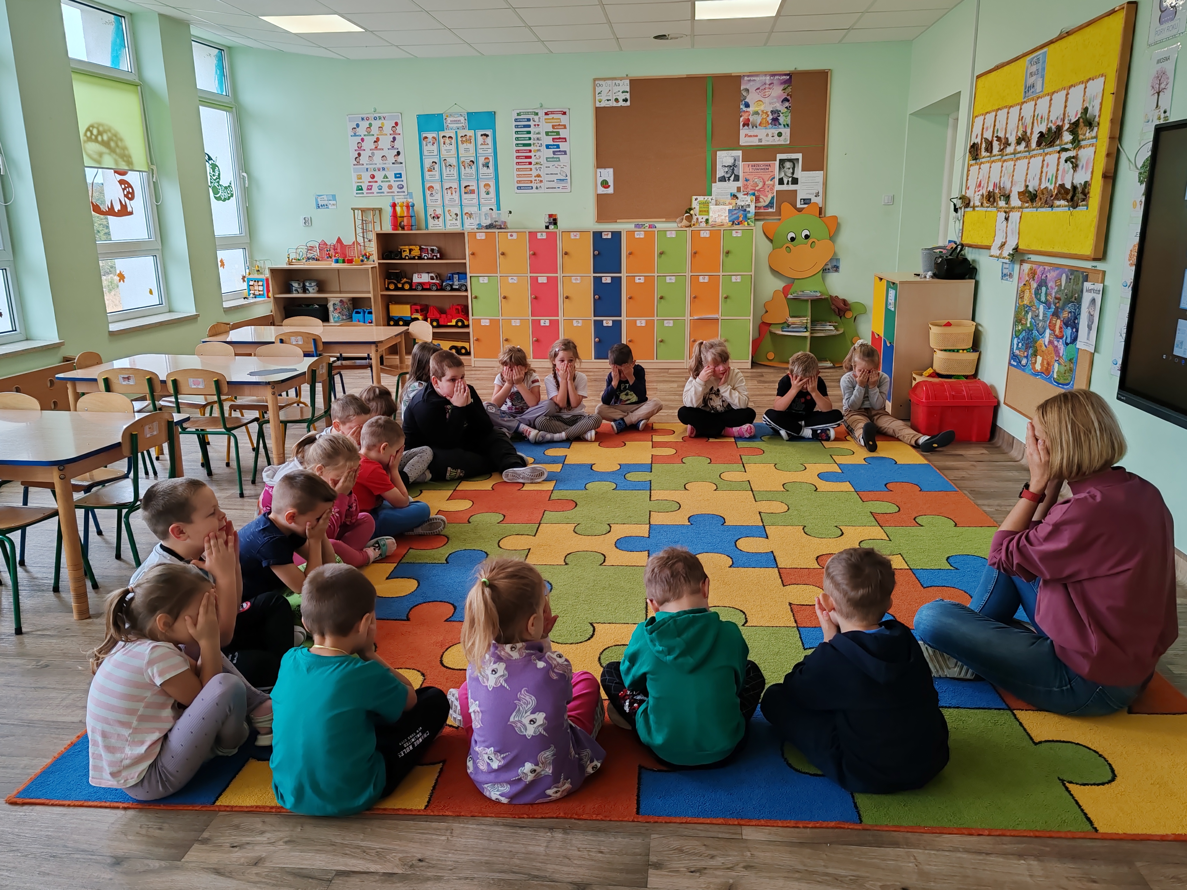 Przedszkolaki poznały nową emocję - smutek. Markotek z Wyspy Smutku opowiedział w bajce kiedy się pojawia i jak długo trwa. Dzieci bawiły się z chmurkami, których kolory oznaczały natężenie smutku, była również zabawa ruchowa a także kolorowanki.