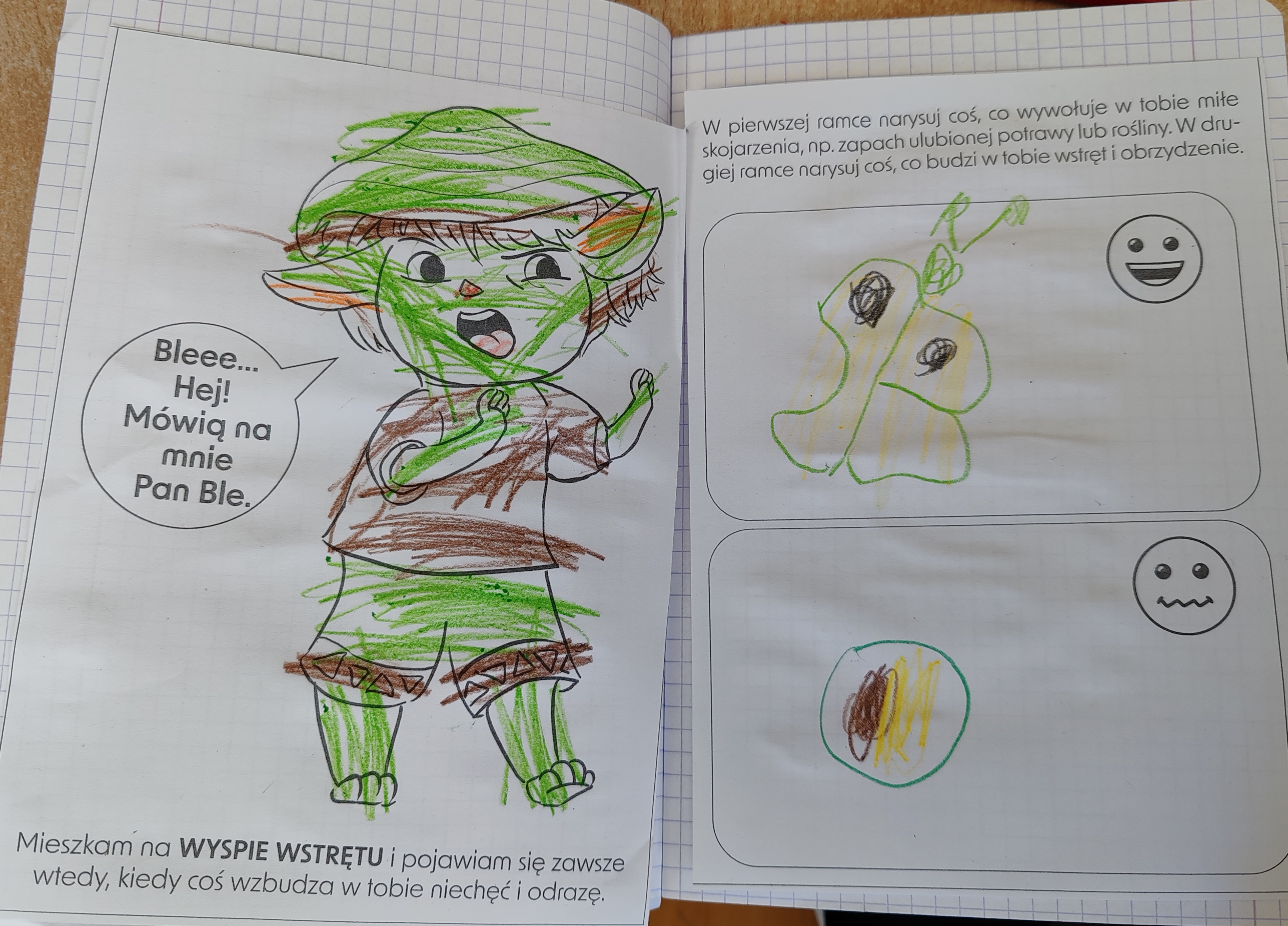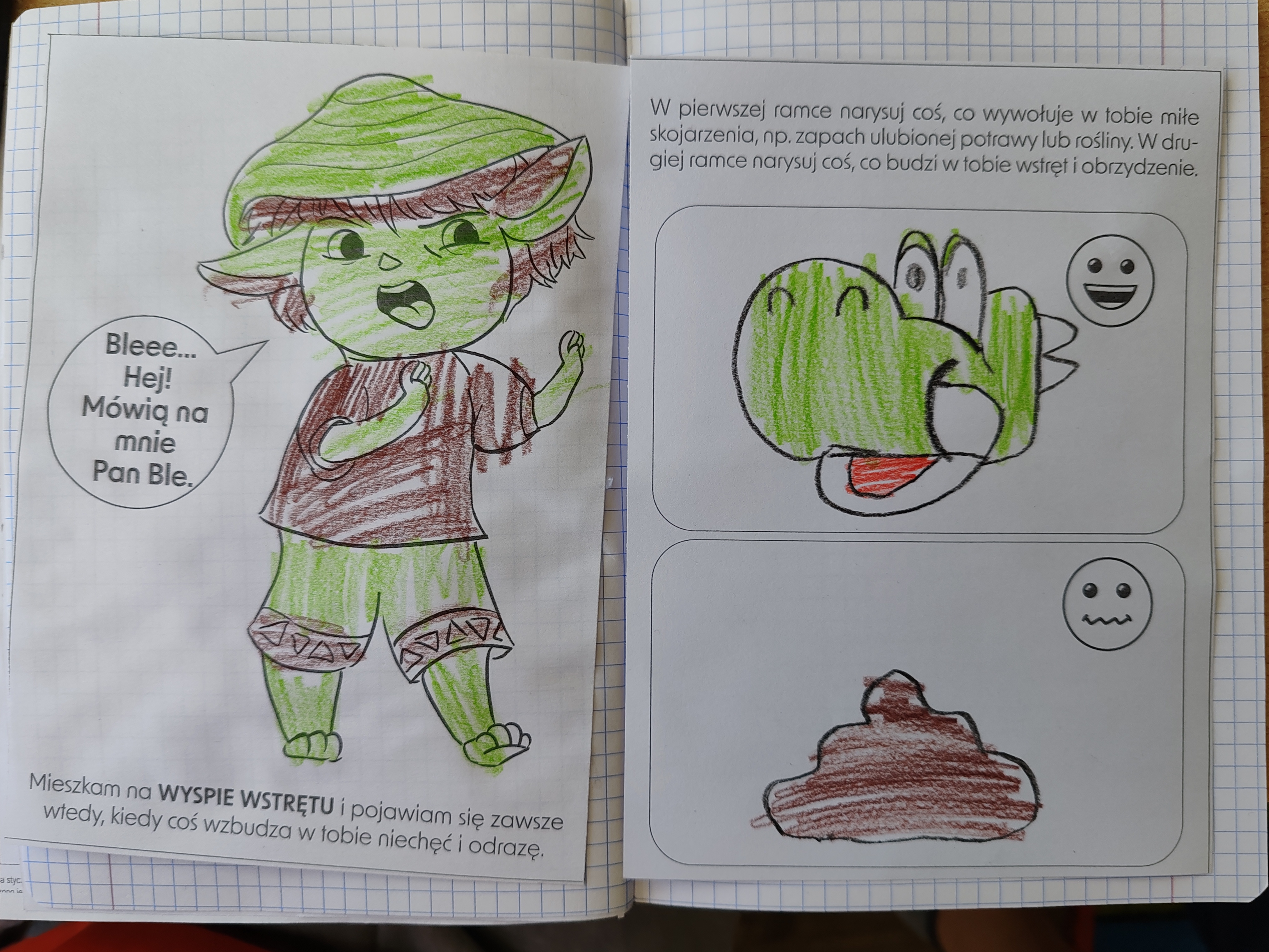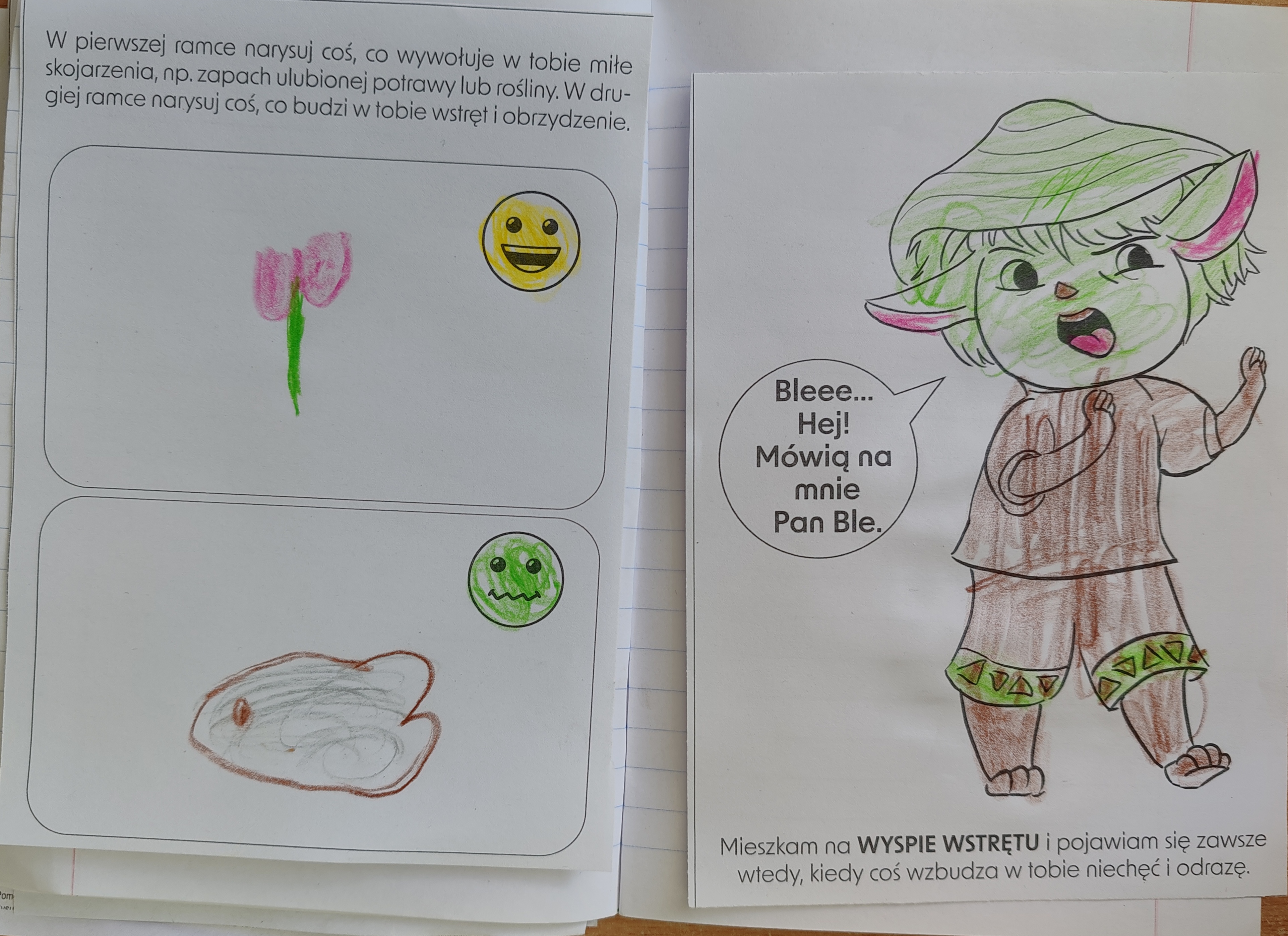 Przedszkolaki poznały kolejną emocję - Pana Ble z Wyspy Wstrętu. Dzieci wysłuchały opowiadania o poznanej emocji, rozmawiały o niej, a na koniec zajęć kolorowały i rysowały coś miłego oraz coś co budzi w nich wstręt.
