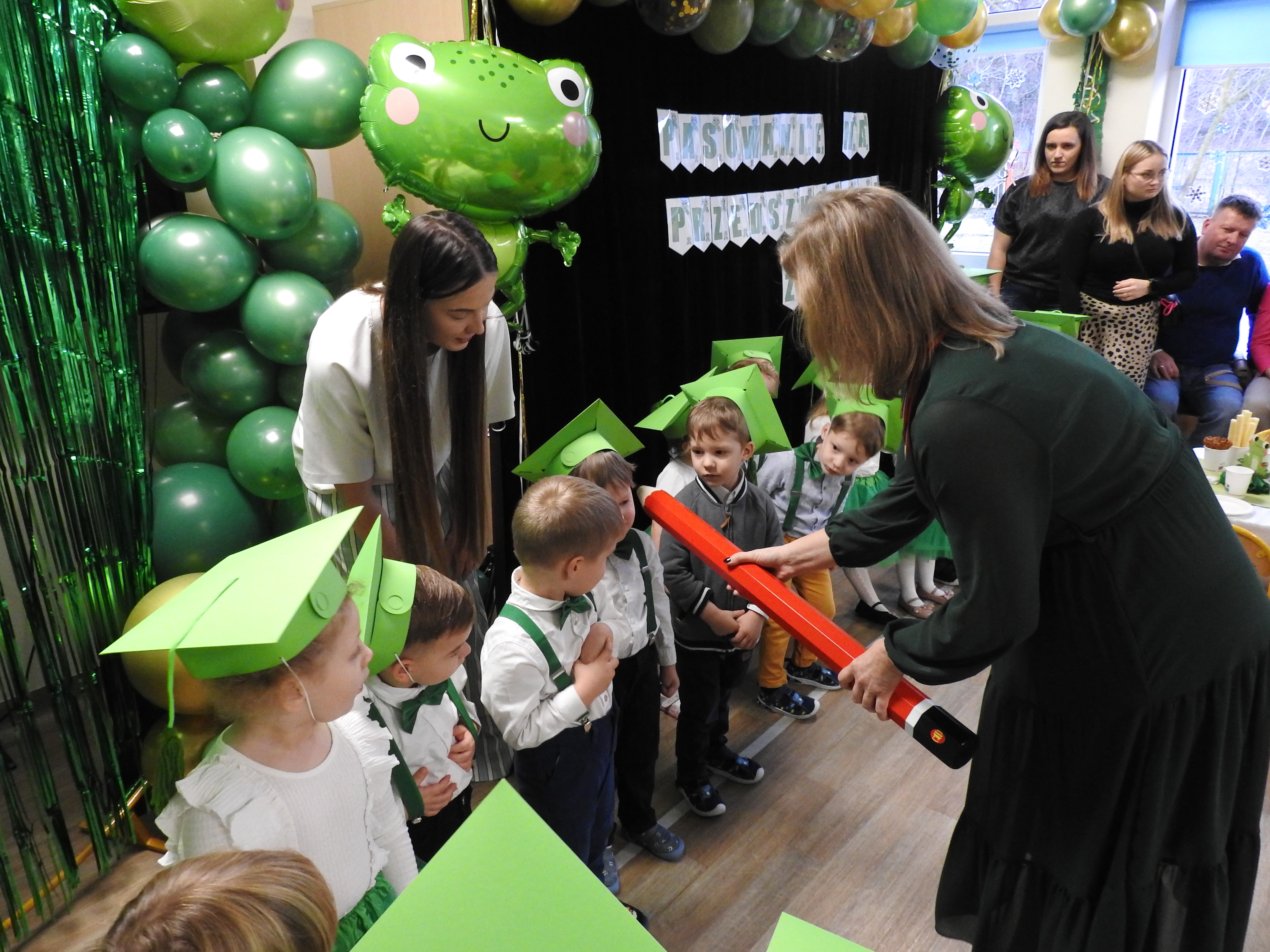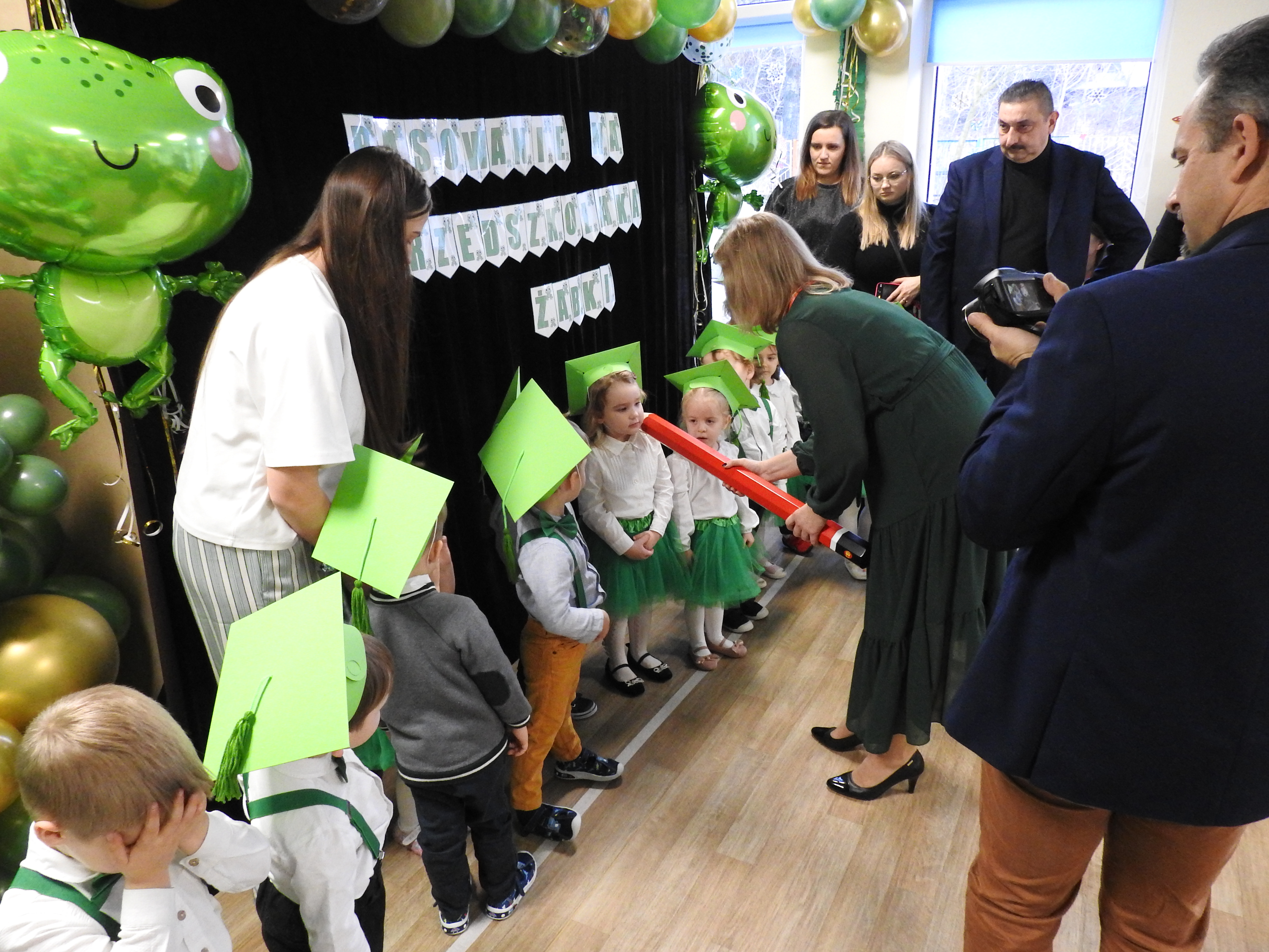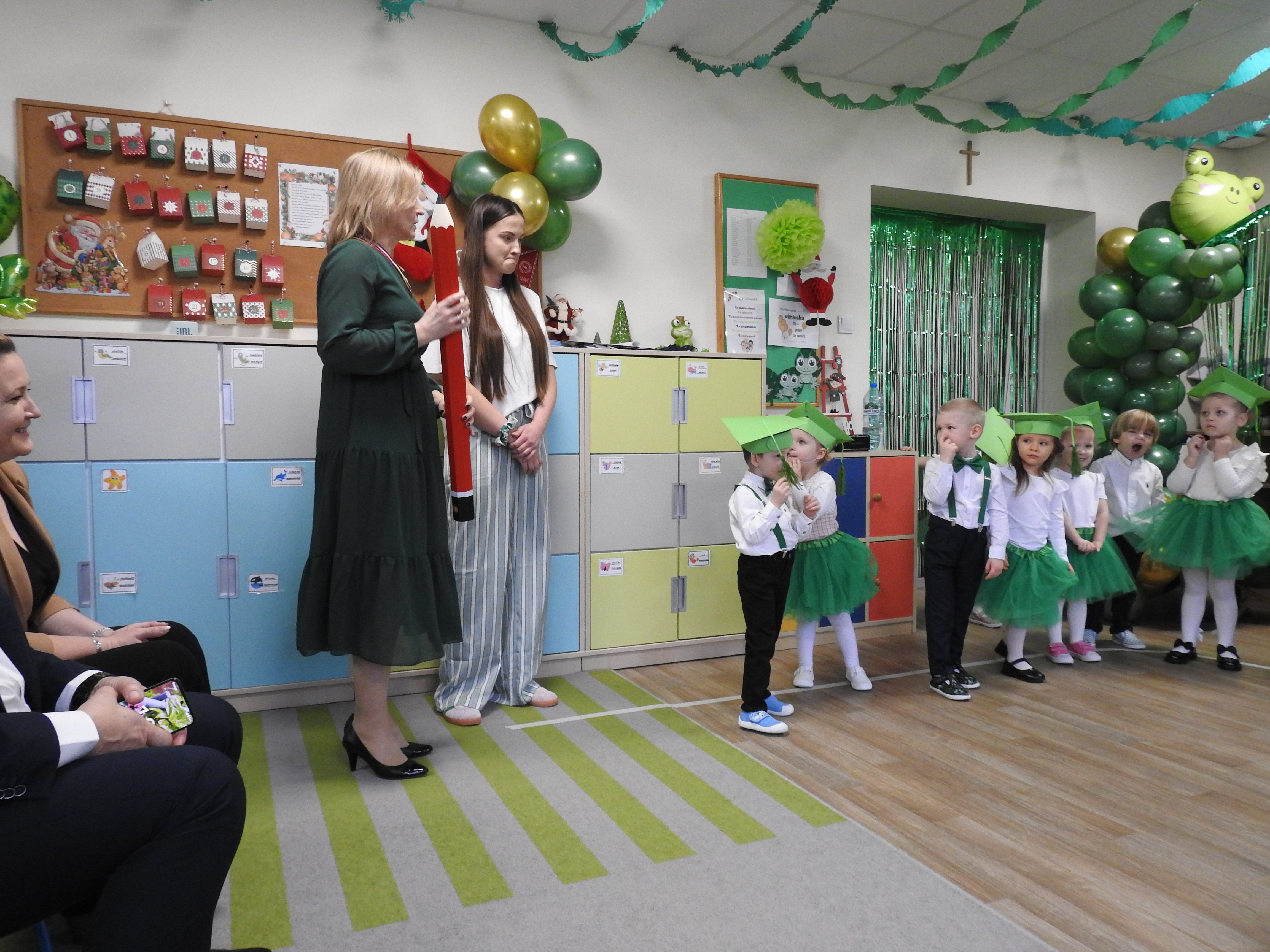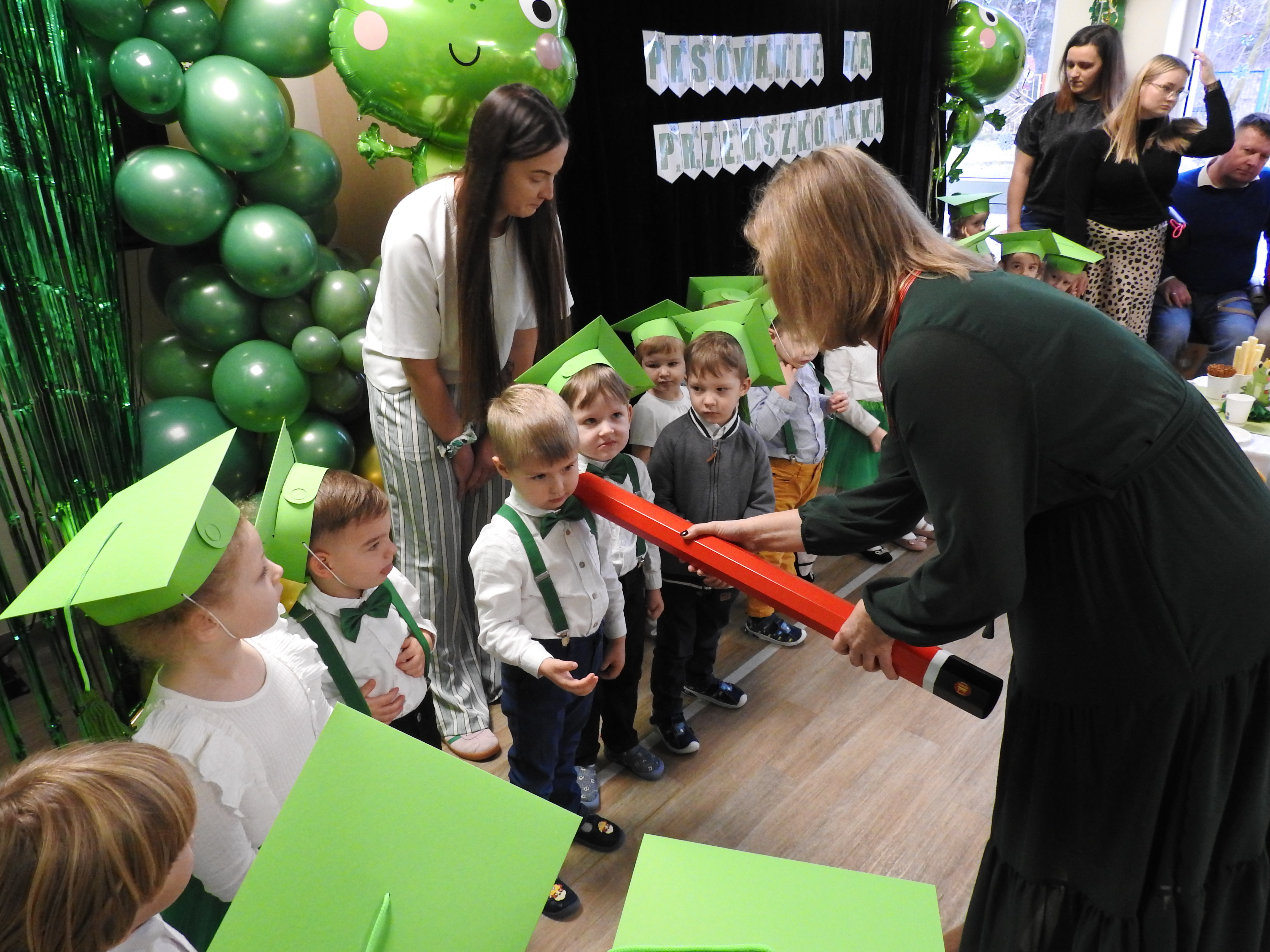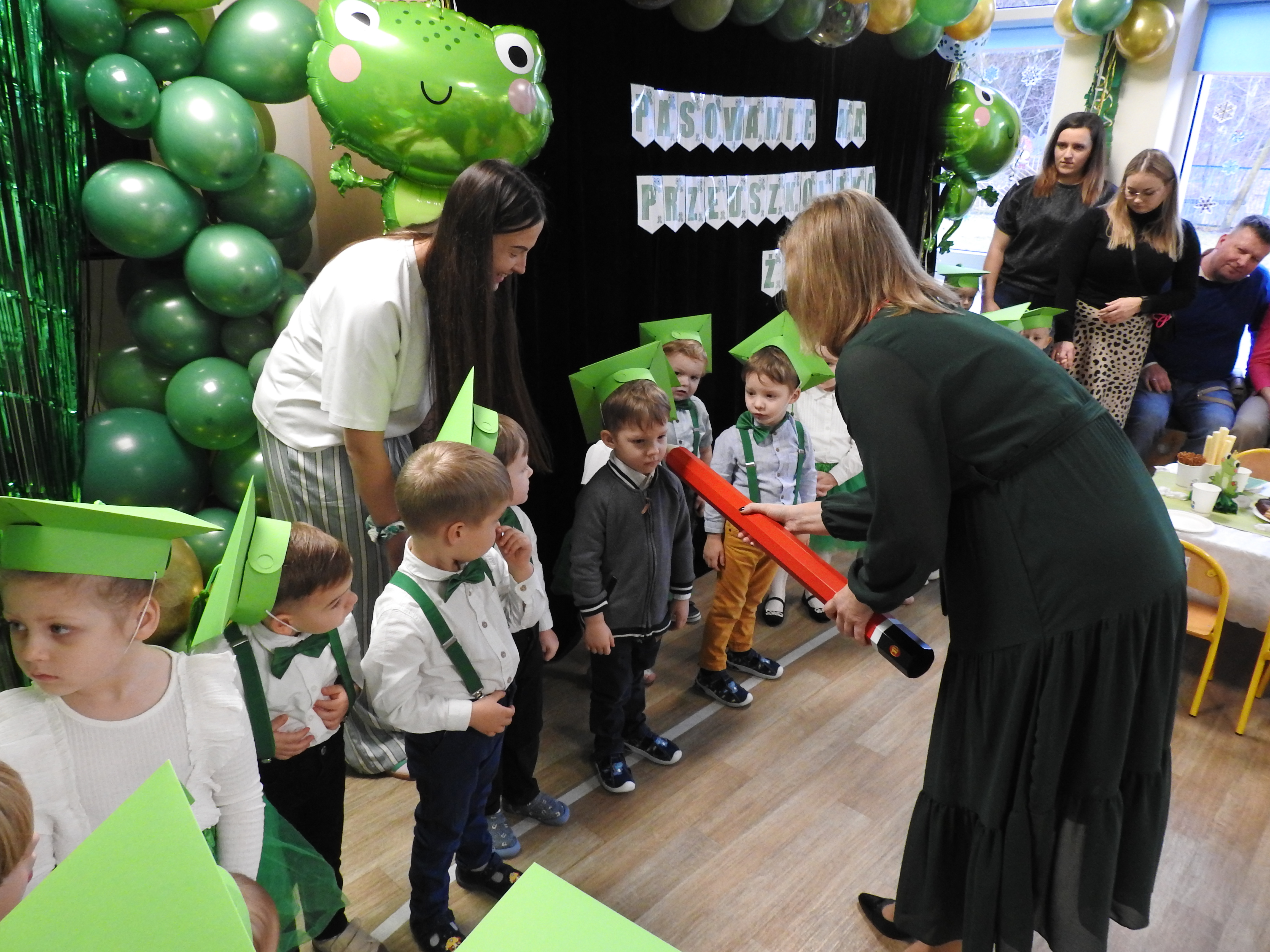 10 GRUDNIA W NASZYM PRZEDSZKOLU ODBYŁO SIĘ UROCZYSTE PASOWANIE NA PRZEDSZKOLAKA DZIECI Z GRUPY "ŻABKI". Z TEJ OKAZJI RODZICE PIĘKNIE PRZYSTROILI SALĘ PRZEDSZKOLNĄ I POMOGLI W PRZYGOTOWANIU DZIECI DO TAK WAŻNEJ W ICH ŻYCIU ZMIANY. ZAPROSILIŚMY GOŚCI: PANA JERZEGO LEWCZUKA BURMISTRZA MIASTA I GMINY IZBICA ORAZ PANIĄ ANETĘ KISTER-KIEŁB DYREKTORA SAMORZĄDOWEGO OŚRODKA OŚWIATY W IZBICY. DZIECI PIĘKNIE ZAPREZENTOWAŁY SIĘ WIERSZEM I PIOSENKĄ. BYŁA RADOŚĆ, WZRUSZENIE I DUMA RODZICÓW ZE SWOICH POCIECH, A ZWIEŃCZENIEM WYDARZENIA BYŁO UROCZYSTE PASOWANIE OKAZAŁYM OŁÓWKIEM I PRZEPYSZNY , PIĘKNY TORT OCZYWIŚCIE Z MOTYWEM ŻABEK.