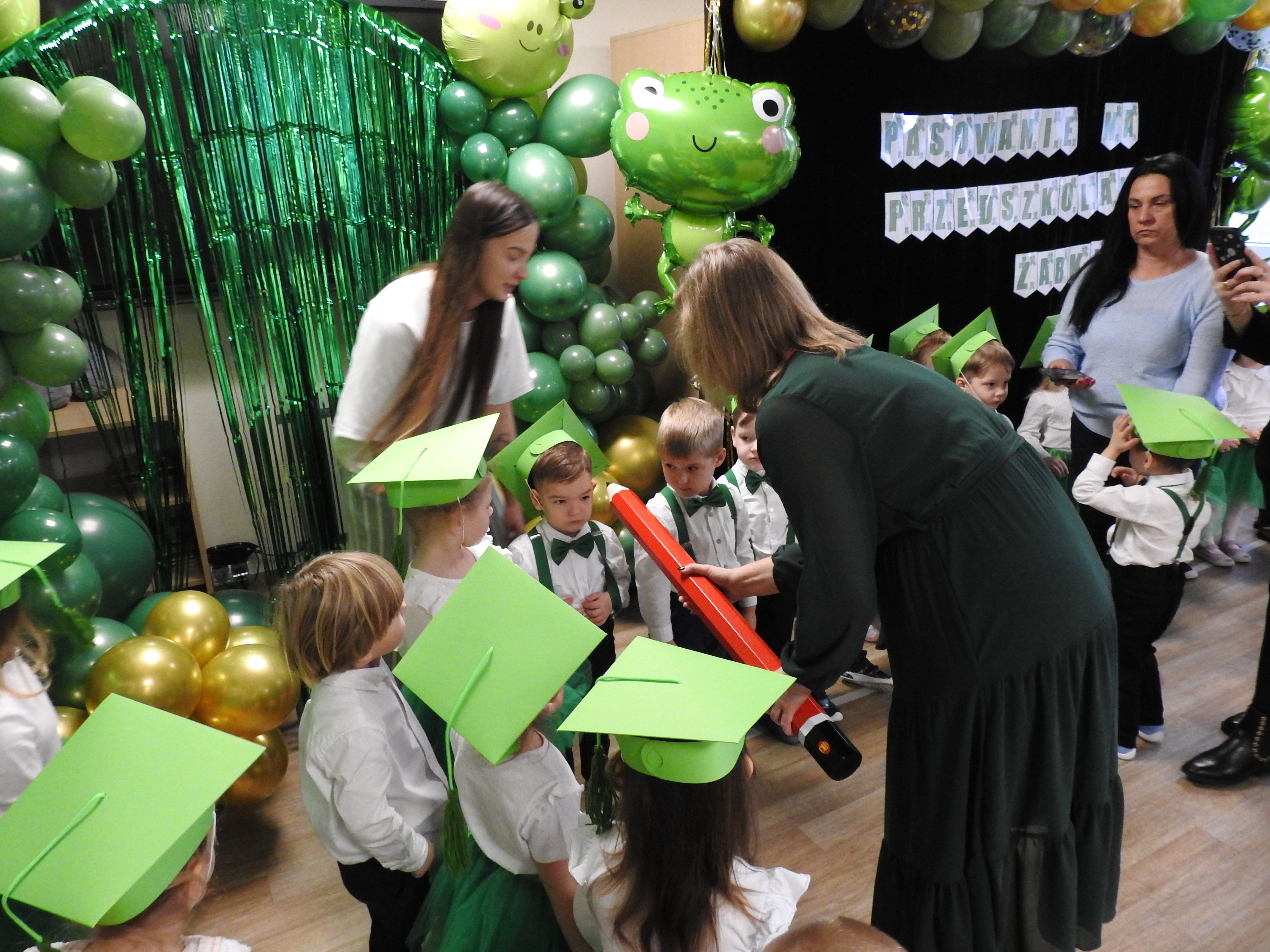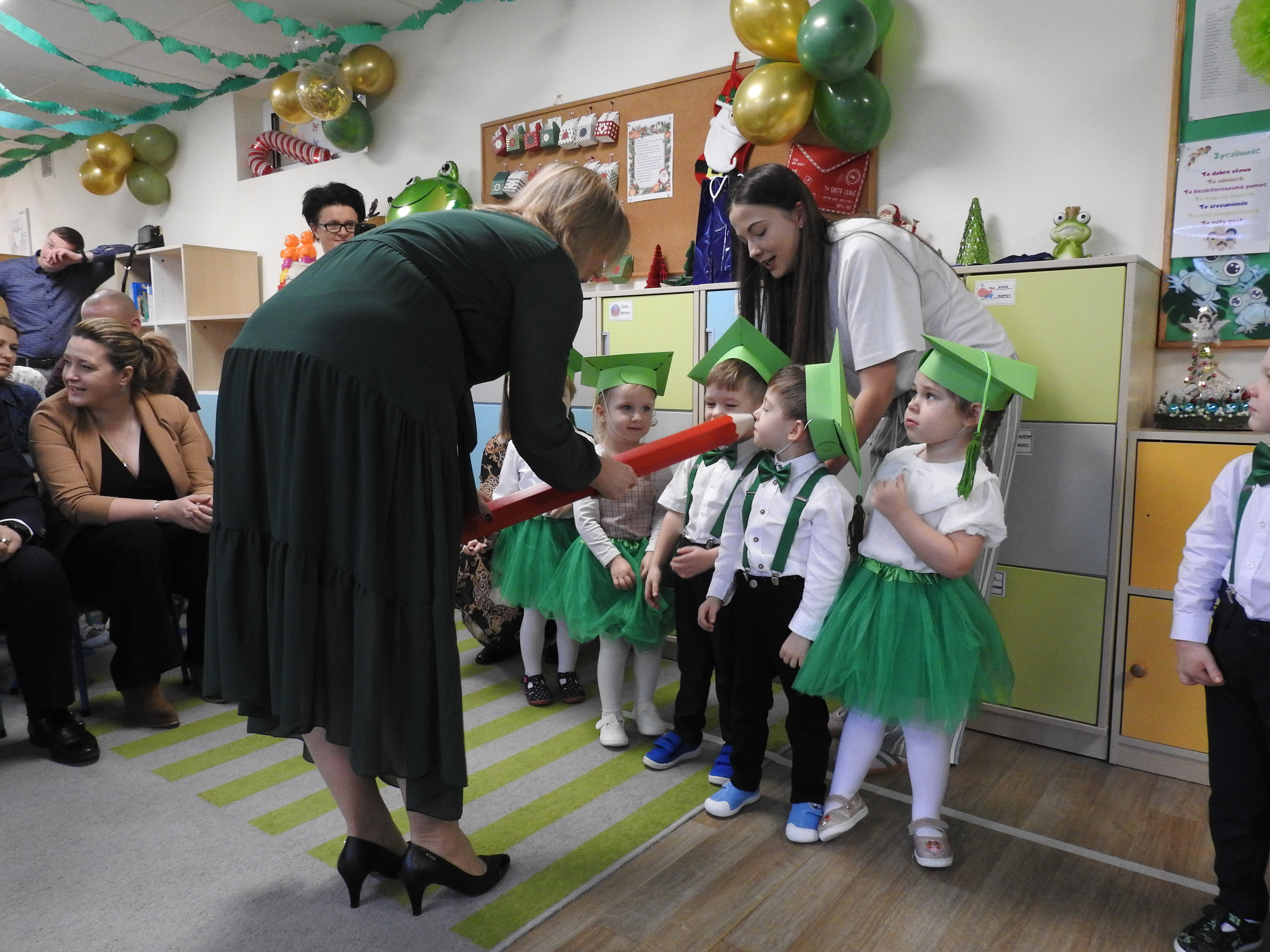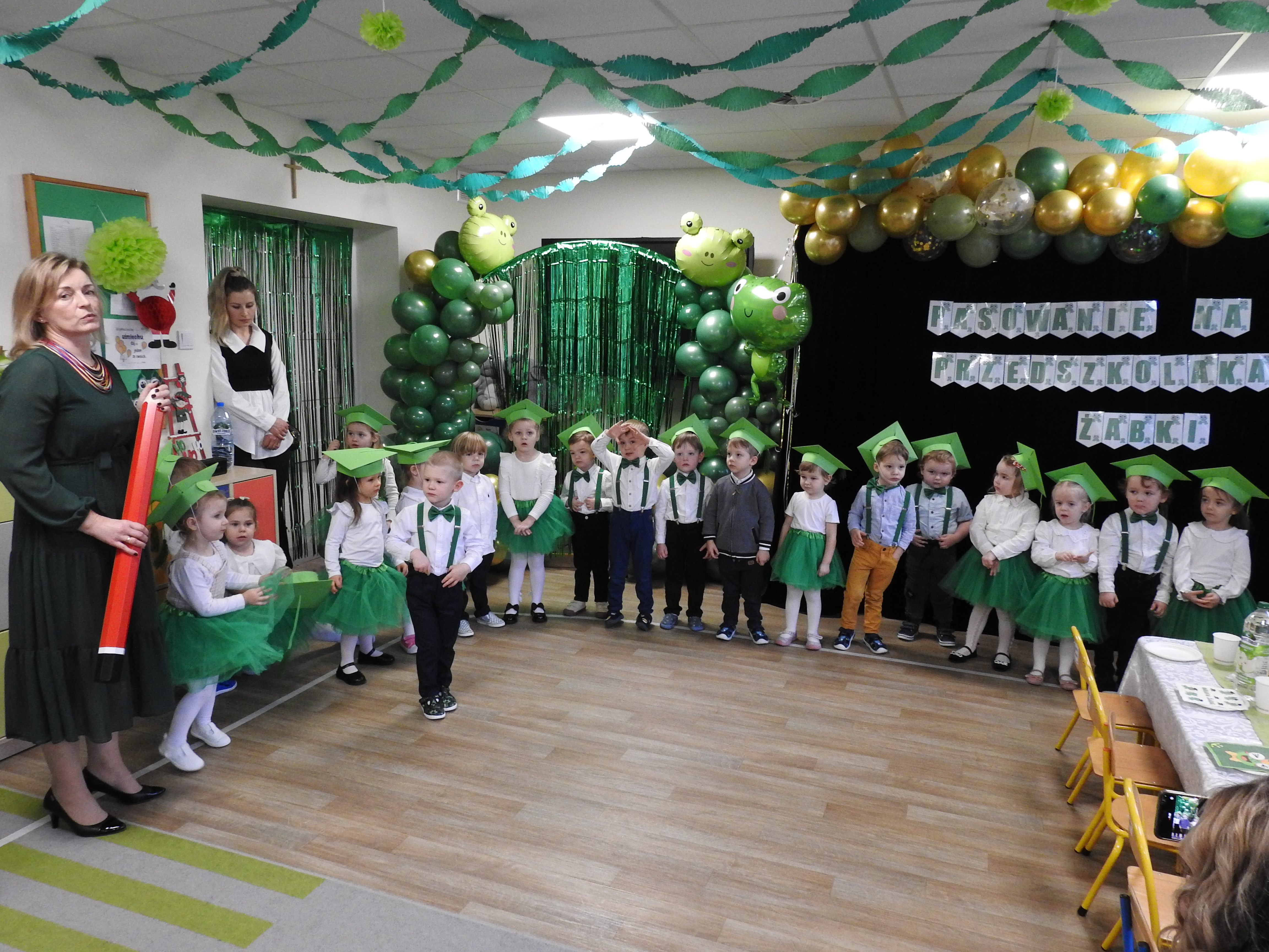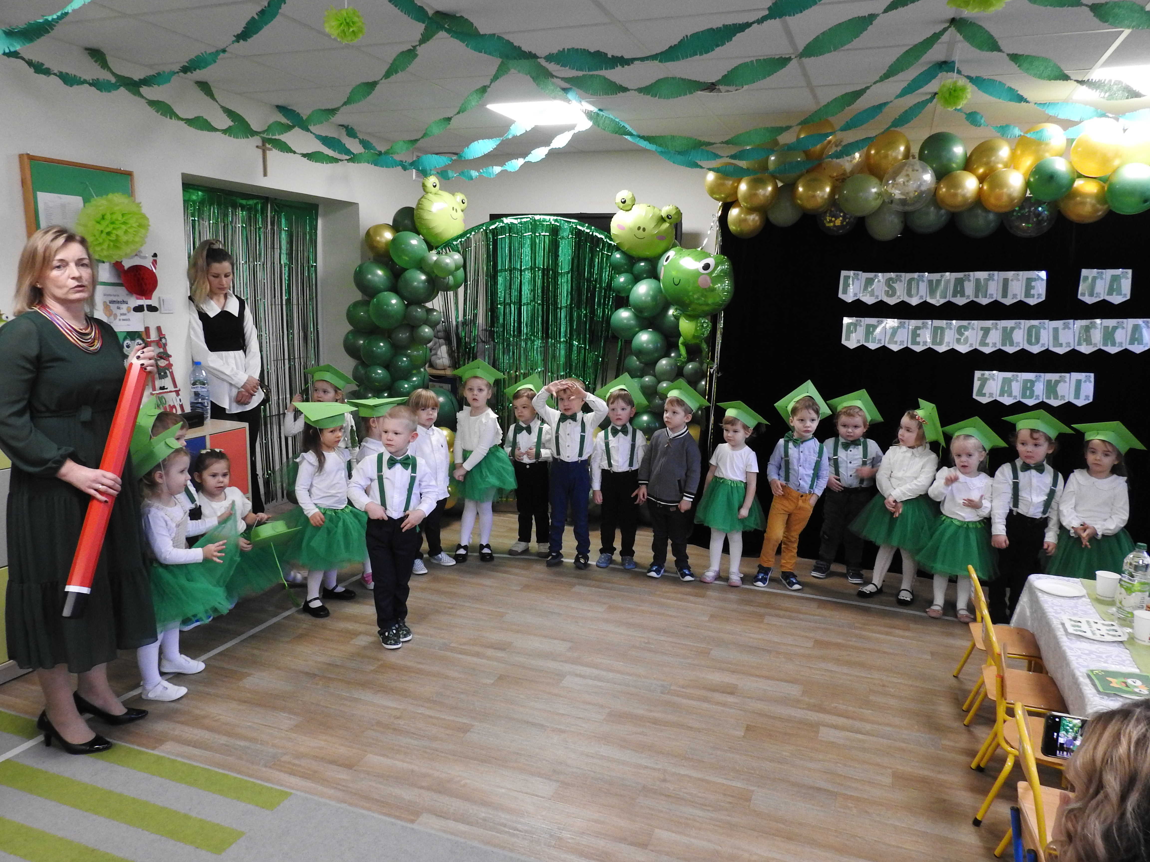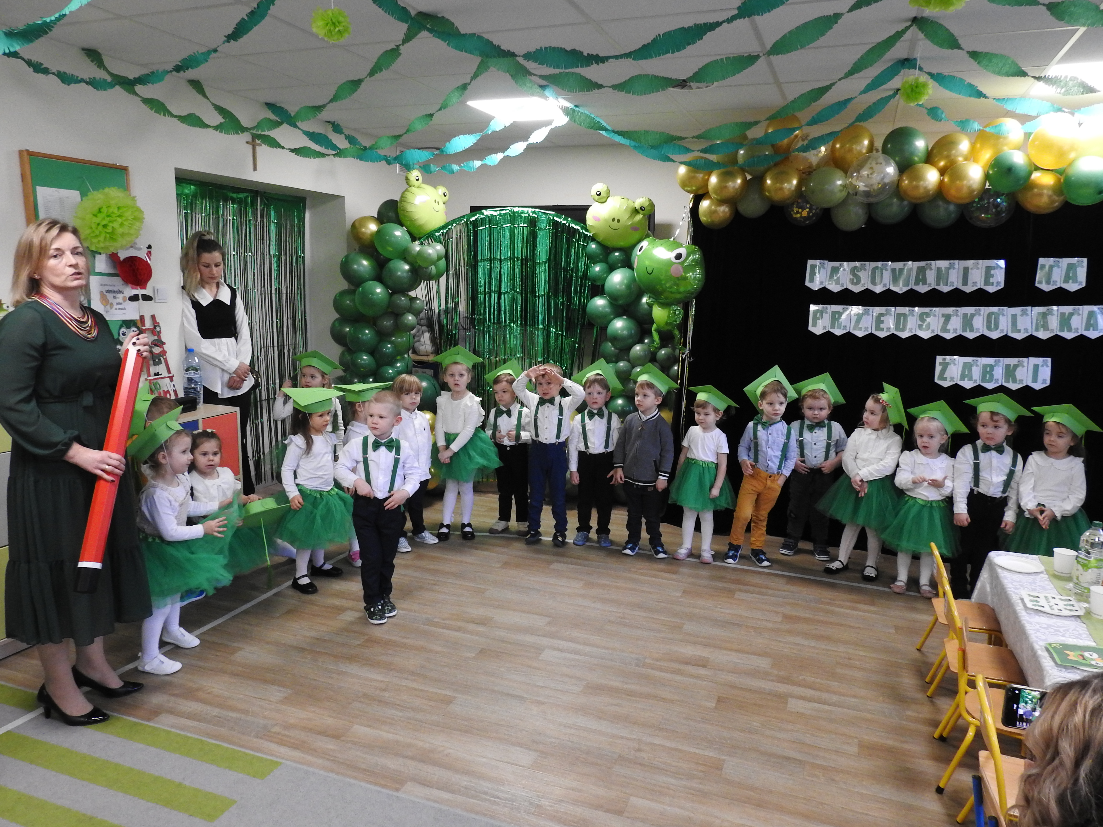10 GRUDNIA W NASZYM PRZEDSZKOLU ODBYŁO SIĘ UROCZYSTE PASOWANIE NA PRZEDSZKOLAKA DZIECI Z GRUPY "ŻABKI". Z TEJ OKAZJI RODZICE PIĘKNIE PRZYSTROILI SALĘ PRZEDSZKOLNĄ I POMOGLI W PRZYGOTOWANIU DZIECI DO TAK WAŻNEJ W ICH ŻYCIU ZMIANY. ZAPROSILIŚMY GOŚCI: PANA JERZEGO LEWCZUKA BURMISTRZA MIASTA I GMINY IZBICA ORAZ PANIĄ ANETĘ KISTER-KIEŁB DYREKTORA SAMORZĄDOWEGO OŚRODKA OŚWIATY W IZBICY. DZIECI PIĘKNIE ZAPREZENTOWAŁY SIĘ WIERSZEM I PIOSENKĄ. BYŁA RADOŚĆ, WZRUSZENIE I DUMA RODZICÓW ZE SWOICH POCIECH, A ZWIEŃCZENIEM WYDARZENIA BYŁO UROCZYSTE PASOWANIE OKAZAŁYM OŁÓWKIEM I PRZEPYSZNY , PIĘKNY TORT OCZYWIŚCIE Z MOTYWEM ŻABEK.