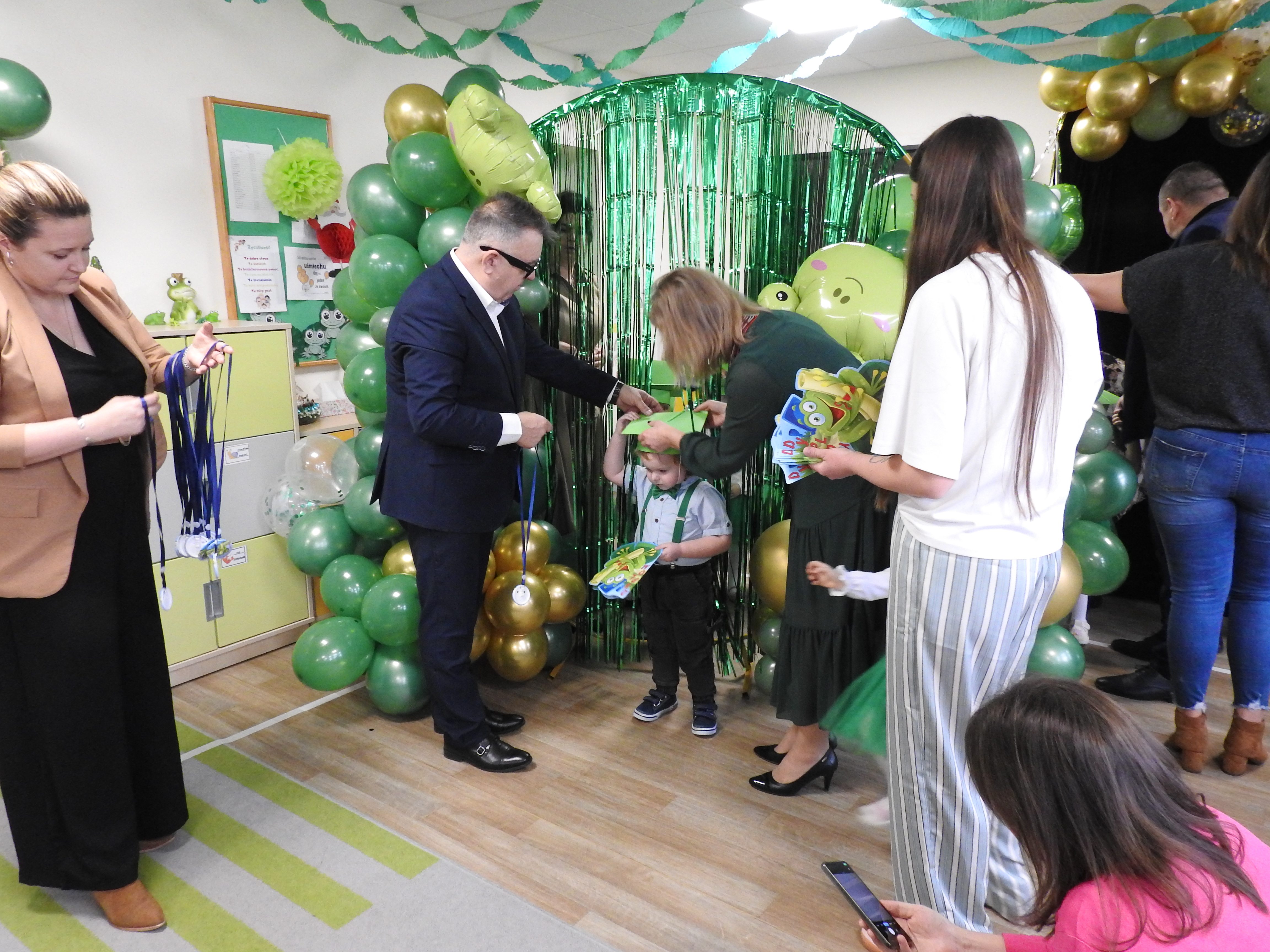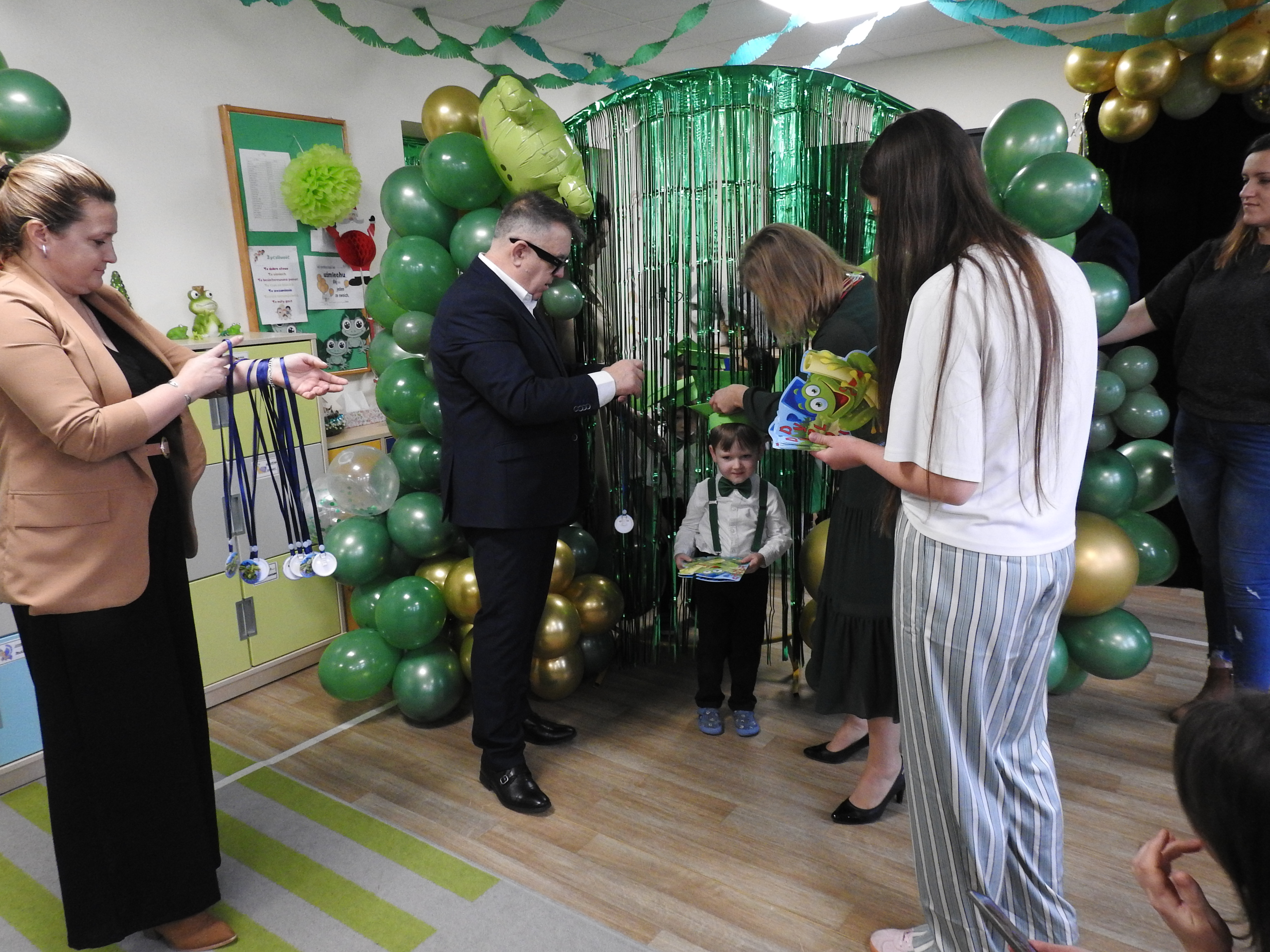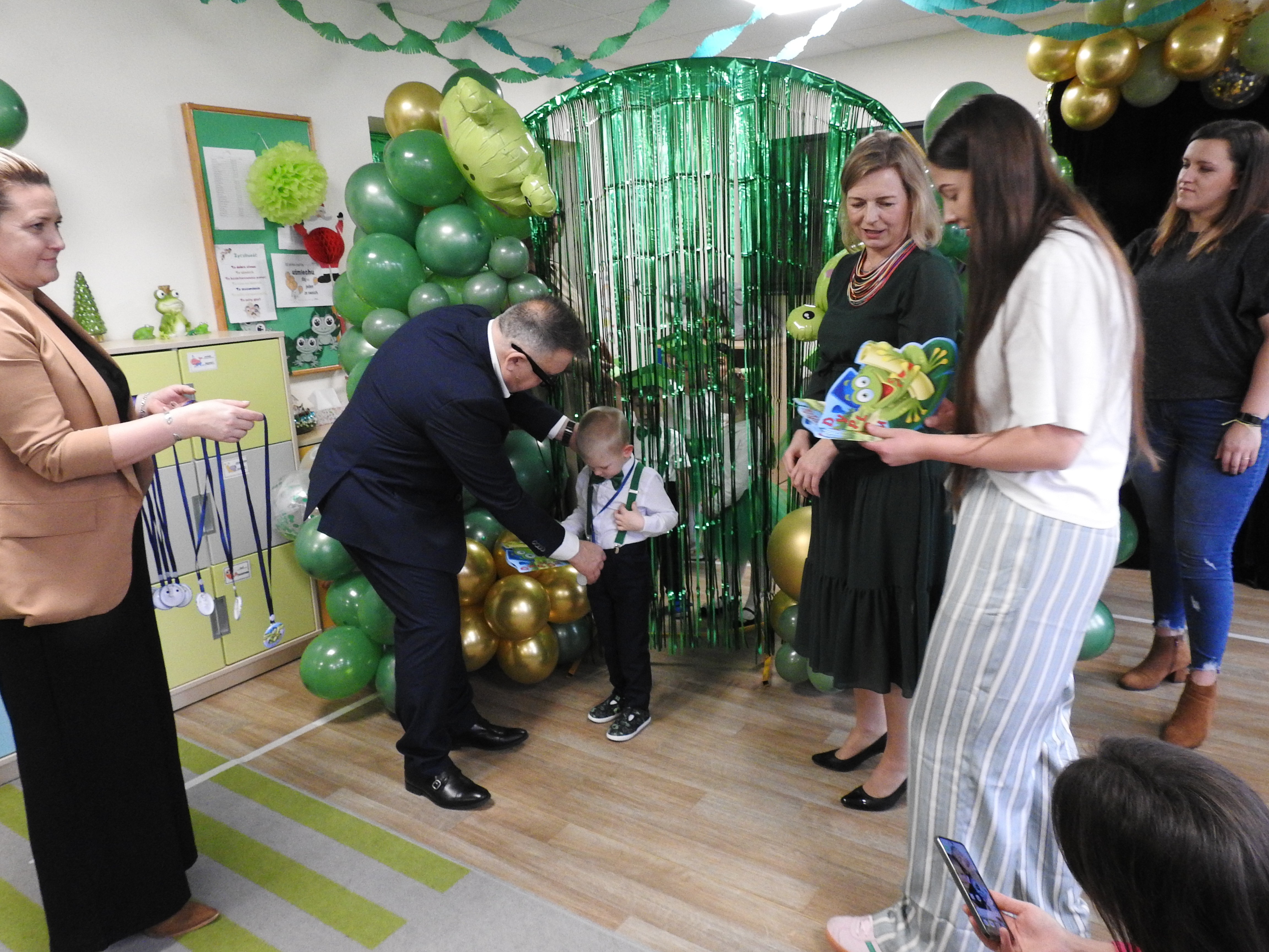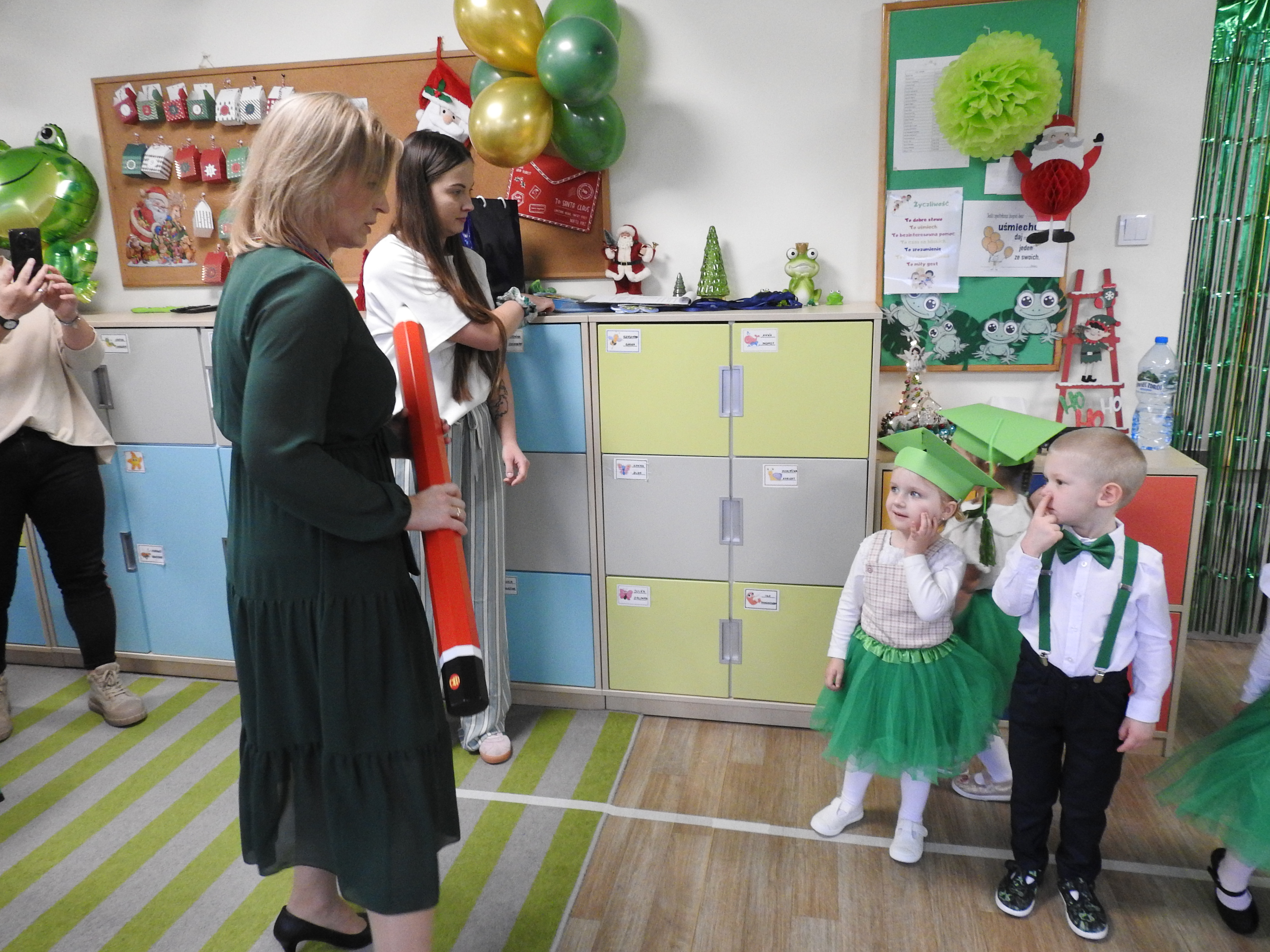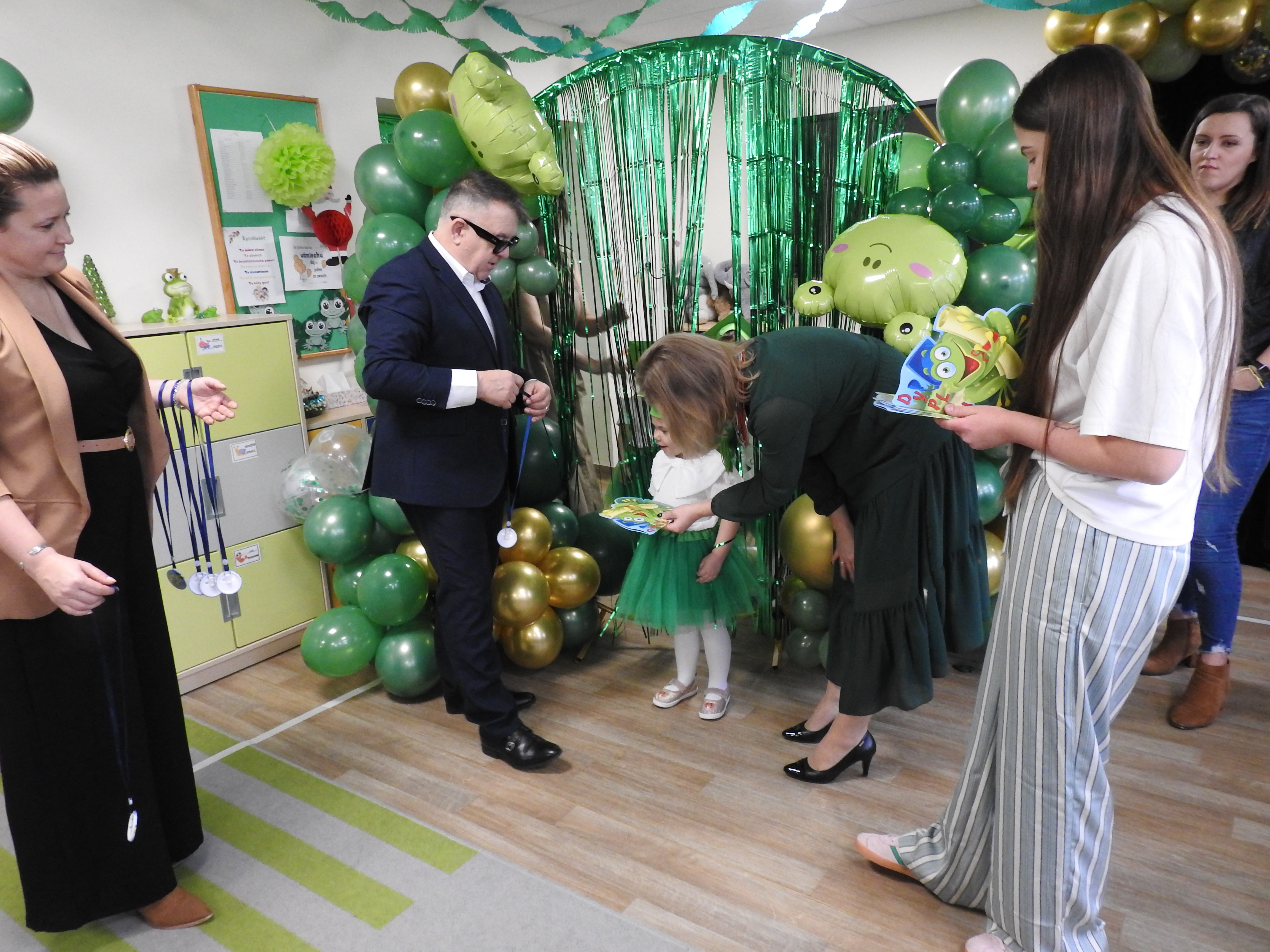 10 GRUDNIA W NASZYM PRZEDSZKOLU ODBYŁO SIĘ UROCZYSTE PASOWANIE NA PRZEDSZKOLAKA DZIECI Z GRUPY "ŻABKI". Z TEJ OKAZJI RODZICE PIĘKNIE PRZYSTROILI SALĘ PRZEDSZKOLNĄ I POMOGLI W PRZYGOTOWANIU DZIECI DO TAK WAŻNEJ W ICH ŻYCIU ZMIANY. ZAPROSILIŚMY GOŚCI: PANA JERZEGO LEWCZUKA BURMISTRZA MIASTA I GMINY IZBICA ORAZ PANIĄ ANETĘ KISTER-KIEŁB DYREKTORA SAMORZĄDOWEGO OŚRODKA OŚWIATY W IZBICY. DZIECI PIĘKNIE ZAPREZENTOWAŁY SIĘ WIERSZEM I PIOSENKĄ. BYŁA RADOŚĆ, WZRUSZENIE I DUMA RODZICÓW ZE SWOICH POCIECH, A ZWIEŃCZENIEM WYDARZENIA BYŁO UROCZYSTE PASOWANIE OKAZAŁYM OŁÓWKIEM I PRZEPYSZNY , PIĘKNY TORT OCZYWIŚCIE Z MOTYWEM ŻABEK.